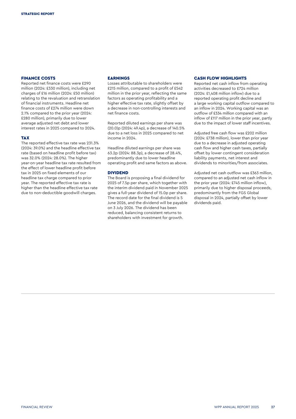 EARNINGS Losses attributable to shareholders were £215 million, compared to a profit of £542 million in the prior year, reflecting the same factors as operating profitability and a higher effective tax rate, slightly offset by a decrease in non-controlling interests and net finance costs. Reported diluted earnings per share was (20.0)p (2024: 49.4p), a decrease of 140.5% due to a net loss in 2025 compared to net income in 2024. Headline diluted earnings per share was 63.2p (2024: 88.3p), a decrease of 28.4%, predominantly due to lower headline operating profit and same factors as above. DIVIDEND The Board is proposing a final dividend for 2025 of 7.5p per share, which together with the interim dividend paid in November 2025 gives a full-year dividend of 15.0p per share. The record date for the final dividend is 5 June 2026, and the dividend will be payable on 3 July 2026. The dividend has been reduced, balancing consistent returns to shareholders with investment for growth. FINANCE COSTS Reported net finance costs were £290 million (2024: £330 million), including net charges of £16 million (2024: £50 million) relating to the revaluation and retranslation of financial instruments. Headline net finance costs of £274 million were down 2.1% compared to the prior year (2024: £280 million), primarily due to lower average adjusted net debt and lower interest rates in 2025 compared to 2024. TAX The reported effective tax rate was 231.3% (2024: 39.0%) and the headline effective tax rate (based on headline profit before tax) was 32.0% (2024: 28.0%). The higher year-on-year headline tax rate resulted from the effect of lower headline profit before tax in 2025 on fixed elements of our headline tax charge compared to prior year. The reported effective tax rate is higher than the headline effective tax rate due to non-deductible goodwill charges. CASH FLOW HIGHLIGHTS Reported net cash inflow from operating activities decreased to £724 million (2024: £1,408 million inflow) due to a reported operating profit decline and a large working capital outflow compared to an inflow in 2024. Working capital was an outflow of £334 million compared with an inflow of £117 million in the prior year, partly due to the impact of lower staff incentives. Adjusted free cash flow was £202 million (2024: £738 million), lower than prior year due to a decrease in adjusted operating cash flow and higher cash taxes, partially offset by lower contingent consideration liability payments, net interest and dividends to minorities/from associates. Adjusted net cash outflow was £363 million, compared to an adjusted net cash inflow in the prior year (2024: £745 million inflow), primarily due to higher disposal proceeds, predominantly from the FGS Global disposal in 2024, partially offset by lower dividends paid. Financial Review WPP ANNUAL REPORT 2025 27 STRATEGIC REPORT