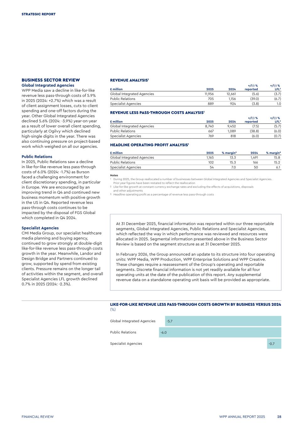 BUSINESS SECTOR REVIEW Global Integrated Agencies WPP Media saw a decline in like-for-like revenue less pass-through costs of 5.9% in 2025 (2024: +2.7%) which was a result of client assignment losses, cuts to client spending and one-off factors during the year. Other Global Integrated Agencies declined 5.6% (2024: -3.9%) year-on-year as a result of lower overall client spending, particularly at Ogilvy which declined high-single digits in the year. There was also continuing pressure on project-based work which weighed on all our agencies. Public Relations In 2025, Public Relations saw a decline in like-for-like revenue less pass-through costs of 6.0% (2024: -1.7%) as Burson faced a challenging environment for client discretionary spending, in particular in Europe. We are encouraged by an improving trend in Q4 and continued new business momentum with positive growth in the US in Q4. Reported revenue less pass-through costs continues to be impacted by the disposal of FGS Global which completed in Q4 2024. Specialist Agencies CMI Media Group, our specialist healthcare media planning and buying agency, continued to grow strongly at double-digit like-for-like revenue less pass-through costs growth in the year. Meanwhile, Landor and Design Bridge and Partners continued to grow, supported by spend from existing clients. Pressure remains on the longer tail of activities within the segment, and overall Specialist Agencies LFL growth declined 0.7% in 2025 (2024: -2.3%). REVENUE ANALYSIS1 £ million 2025 2024 +/(-) % reported +/(-) % LFL2 Global Integrated Agencies 11,956 12,661 (5.6) (3.7) Public Relations 705 1,156 (39.0) (6.7) Specialist Agencies 889 924  (3.8)  1.0 REVENUE LESS PASS-THROUGH COSTS ANALYSIS1 £ million 2025 2024 +/(-) % reported +/(-) % LFL2 Global Integrated Agencies 8,740 9,452 (7.5) (5.7) Public Relations 667 1,089 (38.8) (6.0) Specialist Agencies 769 818 (6.0)  (0.7)  HEADLINE OPERATING PROFIT ANALYSIS1 £ million 2025 % margin3 2024 % margin3 Global Integrated Agencies 1,165 13.3 1,491 15.8 Public Relations 102 15.3 166 15.2 Specialist Agencies 54 7.0  50 6.1  Notes 1 During 2025, the Group reallocated a number of businesses between Global Integrated Agencies and Specialist Agencies. Prior year figures have been restated to reflect the reallocation 2 Like-for-like growth at constant currency exchange rates and excluding the effects of acquisitions, disposals and other adjustments 3 Headline operating profit as a percentage of revenue less pass-through costs At 31 December 2025, financial information was reported within our three reportable segments, Global Integrated Agencies, Public Relations and Specialist Agencies, which reflected the way in which performance was reviewed and resources were allocated in 2025. Segmental information presented above in the Business Sector Review is based on the segment structure as at 31 December 2025. In February 2026, the Group announced an update to its structure into four operating units: WPP Media, WPP Production, WPP Enterprise Solutions and WPP Creative. These changes require a reassessment of the Group’s operating and reportable segments. Discrete financial information is not yet readily available for all four operating units at the date of the publication of this report. Any supplemental revenue data on a standalone operating unit basis will be provided as appropriate. LIKE-FOR-LIKE REVENUE LESS PASS-THROUGH COSTS GROWTH BY BUSINESS VERSUS 2024 (%) Global Integrated Agencies Public Relations Specialist Agencies -5.7 -6.0 -0.7 Financial Review WPP ANNUAL REPORT 2025 28 STRATEGIC REPORT