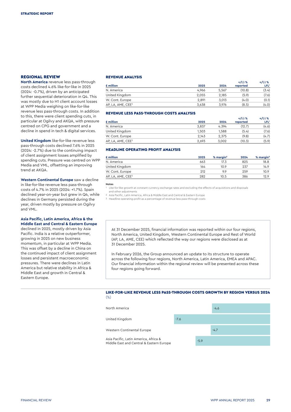 REGIONAL REVIEW North America revenue less pass-through costs declined 4.6% like-for-like in 2025 (2024: -0.7%), driven by an anticipated further sequential deterioration in Q4. This was mostly due to H1 client account losses at WPP Media weighing on like-for-like revenue less pass-through costs. In addition to this, there were client spending cuts, in particular at Ogilvy and AKQA, with pressure centred on CPG and government and a decline in spend in tech & digital services. United Kingdom like-for-like revenue less pass-through costs declined 7.6% in 2025 (2024: -2.7%) due to the continuing impact of client assignment losses amplified by spending cuts. Pressure was centred on WPP Media and VML, offsetting an improving trend at AKQA. Western Continental Europe saw a decline in like-for-like revenue less pass-through costs of 4.7% in 2025 (2024: +1.7%). Spain declined year-on-year but grew in Q4, while declines in Germany persisted during the year, driven mostly by pressure on Ogilvy and VML. Asia Pacific, Latin America, Africa & the Middle East and Central & Eastern Europe declined in 2025, mostly driven by Asia Pacific. India is a relative outperformer, growing in 2025 on new business momentum, in particular at WPP Media. This was offset by a decline in China on the continued impact of client assignment losses and persistent macroeconomic pressures. There were declines in Latin America but relative stability in Africa & Middle East and growth in Central & Eastern Europe. At 31 December 2025, financial information was reported within our four regions, North America, United Kingdom, Western Continental Europe and Rest of World (AP, LA, AME, CEE) which reflected the way our regions were disclosed as at 31 December 2025. In February 2026, the Group announced an update to its structure to operate across the following four regions, North America, Latin America, EMEA and APAC. Our financial information within the regional review will be presented across these four regions going forward. REVENUE ANALYSIS £ million 2025 2024 +/(-) % reported +/(-) % LFL1 N. America 4,966 5,567 (10.8) (3.4) United Kingdom 2,055 2,185 (5.9) (7.6) W. Cont. Europe 2,891 3,013  (4.0) (0.1) AP, LA, AME, CEE2 3,638 3,976  (8.5) (4.0) REVENUE LESS PASS-THROUGH COSTS ANALYSIS £ million 2025 2024 +/(-) % reported +/(-) % LFL1 N. America 3,837 4.394 (12.7) (4.6) United Kingdom 1,503 1,588 (5.4) (7.6) W. Cont. Europe 2,143 2,375 (9.8)  (4.7) AP, LA, AME, CEE2 2,693 3,002  (10.3)  (5.9) HEADLINE OPERATING PROFIT ANALYSIS £ million 2025 % margin3 2024 % margin3 N. America 663 17.3 825 18.8 United Kingdom 164 10.9 237 14.9 W. Cont. Europe 212 9.9 259 10.9 AP, LA, AME, CEE2 282 10.5 386 12.9 Notes 1 Like-for-like growth at constant currency exchange rates and excluding the effects of acquisitions and disposals and other adjustments 2 Asia Pacific, Latin America, Africa & Middle East and Central & Eastern Europe 3 Headline operating profit as a percentage of revenue less pass-through costs North America United Kingdom Western Continental Europe Asia Pacific, Latin America, Africa & Middle East and Central & Eastern Europe -4.6 -7.6 -4.7 -5.9 LIKE-FOR-LIKE REVENUE LESS PASS-THROUGH COSTS GROWTH BY REGION VERSUS 2024 (%) Financial Review WPP ANNUAL REPORT 2025 29 STRATEGIC REPORT
