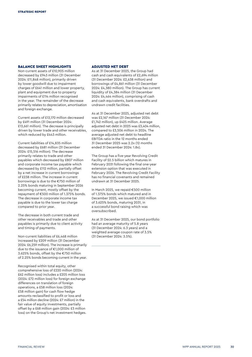 BALANCE SHEET HIGHLIGHTS Non-current assets of £10,905 million decreased by £943 million (31 December 2024: £11,848 million), primarily driven by lower goodwill due to impairment charges of £641 million and lower property, plant and equipment due to property impairments of £114 million recognised in the year. The remainder of the decrease primarily relates to depreciation, amortisation and foreign exchange. Current assets of £13,170 million decreased by £491 million (31 December 2024: £13,661 million). The decrease is principally driven by lower trade and other receivables, which reduced by £443 million. Current liabilities of £14,835 million decreased by £681 million (31 December 2024: £15,516 million). The decrease primarily relates to trade and other payables which decreased by £807 million and corporate income tax payable which decreased by £112 million, partially offset by a net increase in current borrowings of £238 million. The increase in current borrowings is due to the €750 million of 2.25% bonds maturing in September 2026 becoming current, mostly offset by the repayment of €500 million of 1.375% bonds. The decrease in corporate income tax payable is due to the lower tax charge compared to prior year. The decrease in both current trade and other receivables and trade and other payables is primarily due to client activity and timing of payments. Non-current liabilities of £6,468 million increased by £209 million (31 December 2024: £6,259 million). The increase is primarily due to the issuance of €1,000 million of 3.625% bonds, offset by the €750 million of 2.25% bonds becoming current in the year. Recognised within total equity, other comprehensive loss of £220 million (2024: £62 million loss) includes a £205 million loss (2024: £72 million loss) for foreign exchange differences on translation of foreign operations, a £58 million loss (2024: £58 million gain) for cash flow hedge amounts reclassified to profit or loss and a £54 million decline (2024: £7 million) in the fair value of equity investments, partially offset by a £68 million gain (2024: £3 million loss) on the Group’s net investment hedges. ADJUSTED NET DEBT As at 31 December 2025, the Group had cash and cash equivalents of £2,694 million (31 December 2024: £2,638 million) and borrowings of £4,861 million (31 December 2024: £4,380 million). The Group has current liquidity of £4,384 million (31 December 2024: £4,464 million), comprising of cash and cash equivalents, bank overdrafts and undrawn credit facilities. As at 31 December 2025, adjusted net debt was £2,167 million (31 December 2024: £1,742 million), up £425 million. Average adjusted net debt in 2025 was £3,404 million, compared to £3,506 million in 2024. The average adjusted net debt to headline EBITDA ratio in the 12 months ended 31 December 2025 was 2.2x (12 months ended 31 December 2024: 1.8x). The Group has a five-year Revolving Credit Facility of $2.5 billion which matures in February 2031 following the final one-year extension option that was executed in February 2026. The Revolving Credit Facility has no financial covenants and remained undrawn at 31 December 2025. In March 2025, we repaid €500 million of 1.375% bonds which matured and in December 2025, we issued €1,000 million of 3.625% bonds, maturing 2031, in a successful bond raising which was oversubscribed. As at 31 December 2025, our bond portfolio had an average maturity of 5.8 years (31 December 2024: 6.3 years) and a weighted average coupon rate of 3.5% (31 December 2024: 3.5%). WPP ANNUAL REPORT 2025 30 STRATEGIC REPORT FINANCIAL REVIEW