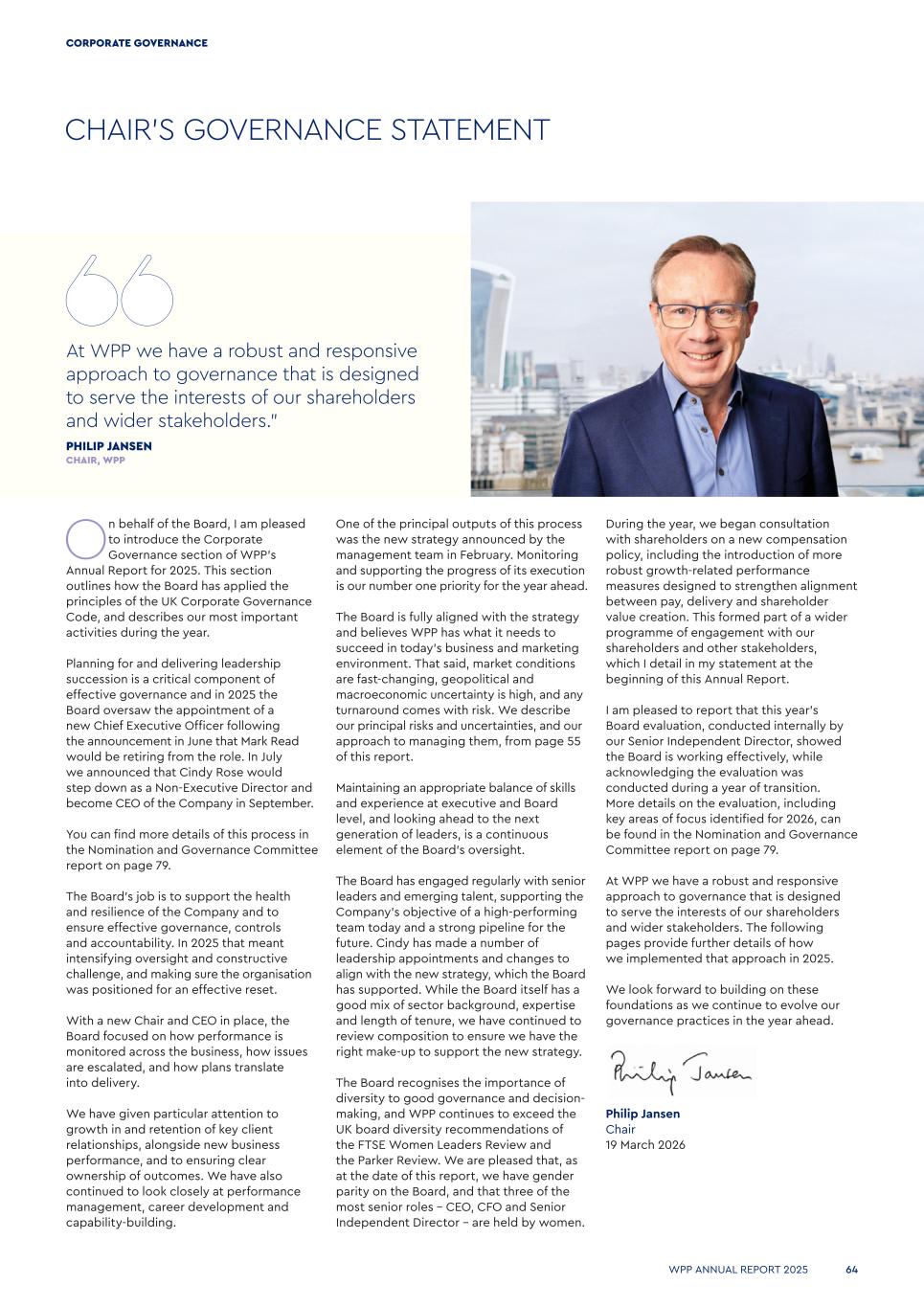 CHAIR’S GOVERNANCE STATEMENT During the year, we began consultation with shareholders on a new compensation policy, including the introduction of more robust growth-related performance measures designed to strengthen alignment between pay, delivery and shareholder value creation. This formed part of a wider programme of engagement with our shareholders and other stakeholders, which I detail in my statement at the beginning of this Annual Report. I am pleased to report that this year’s Board evaluation, conducted internally by our Senior Independent Director, showed the Board is working effectively, while acknowledging the evaluation was conducted during a year of transition. More details on the evaluation, including key areas of focus identified for 2026, can be found in the Nomination and Governance Committee report on page 79. At WPP we have a robust and responsive approach to governance that is designed to serve the interests of our shareholders and wider stakeholders. The following pages provide further details of how we implemented that approach in 2025. We look forward to building on these foundations as we continue to evolve our governance practices in the year ahead. Philip Jansen Chair 19 March 2026 One of the principal outputs of this process was the new strategy announced by the management team in February. Monitoring and supporting the progress of its execution is our number one priority for the year ahead. The Board is fully aligned with the strategy and believes WPP has what it needs to succeed in today’s business and marketing environment. That said, market conditions are fast-changing, geopolitical and macroeconomic uncertainty is high, and any turnaround comes with risk. We describe our principal risks and uncertainties, and our approach to managing them, from page 55 of this report. Maintaining an appropriate balance of skills and experience at executive and Board level, and looking ahead to the next generation of leaders, is a continuous element of the Board’s oversight. The Board has engaged regularly with senior leaders and emerging talent, supporting the Company’s objective of a high-performing team today and a strong pipeline for the future. Cindy has made a number of leadership appointments and changes to align with the new strategy, which the Board has supported. While the Board itself has a good mix of sector background, expertise and length of tenure, we have continued to review composition to ensure we have the right make-up to support the new strategy. The Board recognises the importance of diversity to good governance and decision- making, and WPP continues to exceed the UK board diversity recommendations of the FTSE Women Leaders Review and the Parker Review. We are pleased that, as at the date of this report, we have gender parity on the Board, and that three of the most senior roles – CEO, CFO and Senior Independent Director – are held by women. On behalf of the Board, I am pleased to introduce the Corporate Governance section of WPP’s Annual Report for 2025. This section outlines how the Board has applied the principles of the UK Corporate Governance Code, and describes our most important activities during the year. Planning for and delivering leadership succession is a critical component of effective governance and in 2025 the Board oversaw the appointment of a new Chief Executive Officer following the announcement in June that Mark Read would be retiring from the role. In July we announced that Cindy Rose would step down as a Non-Executive Director and become CEO of the Company in September. You can find more details of this process in the Nomination and Governance Committee report on page 79. The Board’s job is to support the health and resilience of the Company and to ensure effective governance, controls and accountability. In 2025 that meant intensifying oversight and constructive challenge, and making sure the organisation was positioned for an effective reset. With a new Chair and CEO in place, the Board focused on how performance is monitored across the business, how issues are escalated, and how plans translate into delivery. We have given particular attention to growth in and retention of key client relationships, alongside new business performance, and to ensuring clear ownership of outcomes. We have also continued to look closely at performance management, career development and capability-building. At WPP we have a robust and responsive approach to governance that is designed to serve the interests of our shareholders and wider stakeholders.” PHILIP JANSEN CHAIR, WPP WPP ANNUAL REPORT 2025 64 CORPORATE GOVERNANCE
