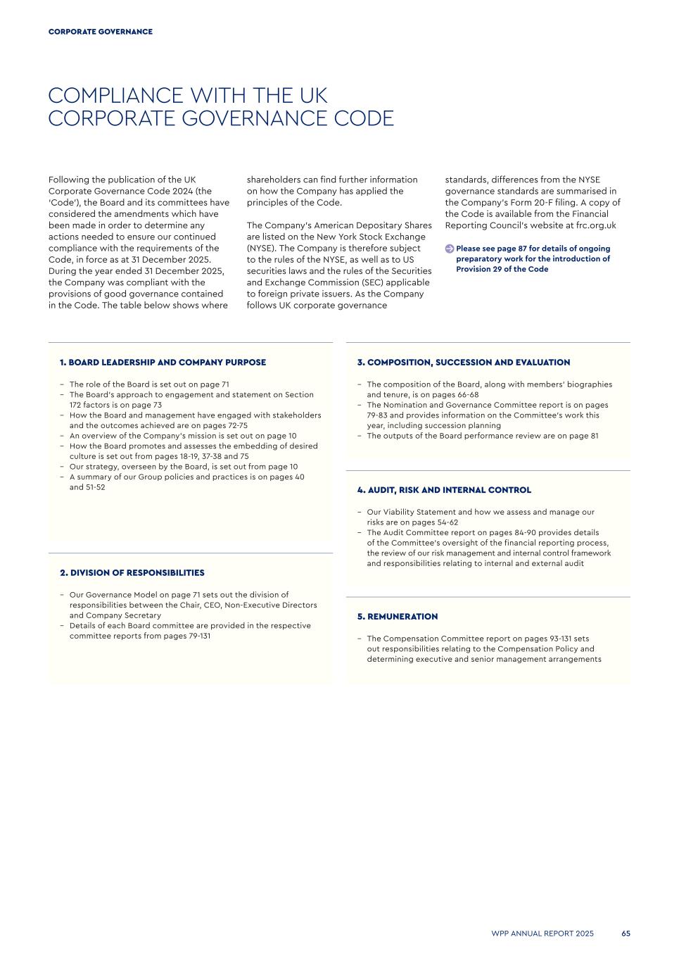 COMPLIANCE WITH THE UK CORPORATE GOVERNANCE CODE Following the publication of the UK Corporate Governance Code 2024 (the ‘Code’), the Board and its committees have considered the amendments which have been made in order to determine any actions needed to ensure our continued compliance with the requirements of the Code, in force as at 31 December 2025. During the year ended 31 December 2025, the Company was compliant with the provisions of good governance contained in the Code. The table below shows where shareholders can find further information on how the Company has applied the principles of the Code. The Company’s American Depositary Shares are listed on the New York Stock Exchange (NYSE). The Company is therefore subject to the rules of the NYSE, as well as to US securities laws and the rules of the Securities and Exchange Commission (SEC) applicable to foreign private issuers. As the Company follows UK corporate governance standards, differences from the NYSE governance standards are summarised in the Company’s Form 20-F filing. A copy of the Code is available from the Financial Reporting Council’s website at frc.org.uk Please see page 87 for details of ongoing preparatory work for the introduction of Provision 29 of the Code 3. COMPOSITION, SUCCESSION AND EVALUATION – The composition of the Board, along with members’ biographies and tenure, is on pages 66-68 – The Nomination and Governance Committee report is on pages 79-83 and provides information on the Committee’s work this year, including succession planning – The outputs of the Board performance review are on page 81 4. AUDIT, RISK AND INTERNAL CONTROL – Our Viability Statement and how we assess and manage our risks are on pages 54-62 – The Audit Committee report on pages 84-90 provides details of the Committee’s oversight of the financial reporting process, the review of our risk management and internal control framework and responsibilities relating to internal and external audit 5. REMUNERATION – The Compensation Committee report on pages 93-131 sets out responsibilities relating to the Compensation Policy and determining executive and senior management arrangements 1. BOARD LEADERSHIP AND COMPANY PURPOSE – The role of the Board is set out on page 71 – The Board’s approach to engagement and statement on Section 172 factors is on page 73 – How the Board and management have engaged with stakeholders and the outcomes achieved are on pages 72-75 – An overview of the Company’s mission is set out on page 10 – How the Board promotes and assesses the embedding of desired culture is set out from pages 18-19, 37-38 and 75 – Our strategy, overseen by the Board, is set out from page 10 – A summary of our Group policies and practices is on pages 40 and 51-52 2. DIVISION OF RESPONSIBILITIES – Our Governance Model on page 71 sets out the division of responsibilities between the Chair, CEO, Non-Executive Directors and Company Secretary – Details of each Board committee are provided in the respective committee reports from pages 79-131 WPP ANNUAL REPORT 2025 65 CORPORATE GOVERNANCE