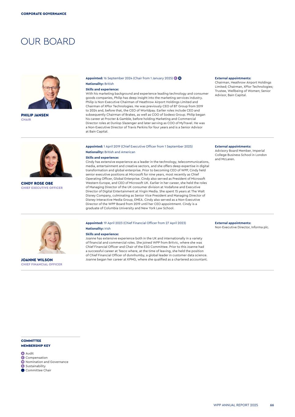 OUR BOARD Appointed: 16 September 2024 (Chair from 1 January 2025) Nationality: British Skills and experience: With his marketing background and experience leading technology and consumer goods companies, Philip has deep insight into the marketing services industry. Philip is Non-Executive Chairman of Heathrow Airport Holdings Limited and Chairman of XPlor Technologies. He was previously CEO of BT Group from 2019 to 2024 and, before that, the CEO of Worldpay. Earlier roles include CEO and subsequently Chairman of Brakes, as well as COO of Sodexo Group. Philip began his career at Procter & Gamble, before holding Marketing and Commercial Director roles at Dunlop Slazenger and later serving as COO of MyTravel. He was a Non-Executive Director of Travis Perkins for four years and is a Senior Advisor at Bain Capital. External appointments: Chairman, Heathrow Airport Holdings Limited; Chairman, XPlor Technologies; Trustee, Wellbeing of Women; Senior Advisor, Bain Capital. PHILIP JANSEN CHAIR Appointed: 1 April 2019 (Chief Executive Officer from 1 September 2025) Nationality: British and American Skills and experience: Cindy has extensive experience as a leader in the technology, telecommunications, media, entertainment and creative sectors, and she offers deep expertise in digital transformation and global enterprise. Prior to becoming CEO of WPP, Cindy held senior executive positions at Microsoft for nine years, most recently as Chief Operating Officer, Global Enterprise. Cindy also served as President of Microsoft Western Europe, and CEO of Microsoft UK. Earlier in her career, she held the roles of Managing Director of the UK consumer division at Vodafone and Executive Director of Digital Entertainment at Virgin Media. She spent 15 years at The Walt Disney Company, culminating as Senior Vice President and Managing Director of Disney Interactive Media Group, EMEA. Cindy also served as a Non-Executive Director of the WPP Board from 2019 until her CEO appointment. Cindy is a graduate of Columbia University and New York Law School. External appointments: Advisory Board Member, Imperial College Business School in London and McLaren. CINDY ROSE OBE CHIEF EXECUTIVE OFFICER External appointments: Non-Executive Director, Informa plc. Appointed: 19 April 2023 (Chief Financial Officer from 27 April 2023) Nationality: Irish Skills and experience: Joanne has extensive experience both in the UK and internationally in a variety of financial and commercial roles. She joined WPP from Britvic, where she was Chief Financial Officer and Chair of the ESG Committee. Prior to this Joanne had a successful career at Tesco where, at the time of leaving, she held the position of Chief Financial Officer of dunnhumby, a global leader in customer data science. Joanne began her career at KPMG, where she qualified as a chartered accountant.JOANNE WILSON CHIEF FINANCIAL OFFICER COMMITTEE MEMBERSHIP KEY Audit Compensation Nomination and Governance Sustainability Committee Chair WPP ANNUAL REPORT 2025 66 CORPORATE GOVERNANCE