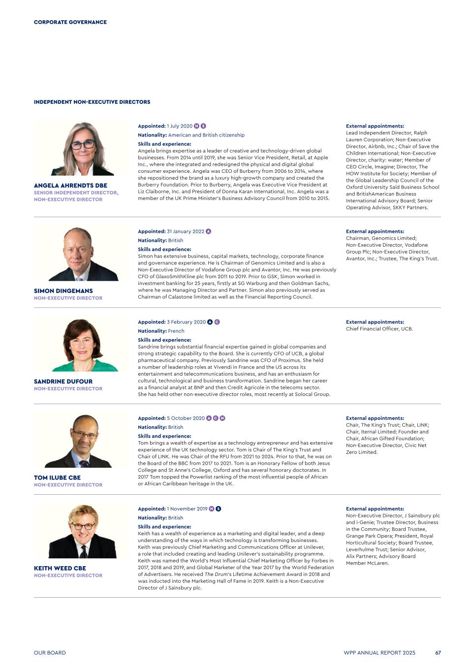 INDEPENDENT NON-EXECUTIVE DIRECTORS ANGELA AHRENDTS DBE SENIOR INDEPENDENT DIRECTOR, NON-EXECUTIVE DIRECTOR Appointed: 1 July 2020   Nationality: American and British citizenship Skills and experience: Angela brings expertise as a leader of creative and technology-driven global businesses. From 2014 until 2019, she was Senior Vice President, Retail, at Apple Inc., where she integrated and redesigned the physical and digital global consumer experience. Angela was CEO of Burberry from 2006 to 2014, where she repositioned the brand as a luxury high-growth company and created the Burberry Foundation. Prior to Burberry, Angela was Executive Vice President at Liz Claiborne, Inc. and President of Donna Karan International, Inc. Angela was a member of the UK Prime Minister’s Business Advisory Council from 2010 to 2015. External appointments: Lead Independent Director, Ralph Lauren Corporation; Non-Executive Director, Airbnb, Inc.; Chair of Save the Children International; Non-Executive Director, charity: water; Member of CEO Circle, Imagine; Director, The HOW Institute for Society; Member of the Global Leadership Council of the Oxford University Saïd Business School and BritishAmerican Business International Advisory Board; Senior Operating Advisor, SKKY Partners. SIMON DINGEMANS NON-EXECUTIVE DIRECTOR Appointed: 31 January 2022   Nationality: British Skills and experience: Simon has extensive business, capital markets, technology, corporate finance and governance experience. He is Chairman of Genomics Limited and is also a Non-Executive Director of Vodafone Group plc and Avantor, Inc. He was previously CFO of GlaxoSmithKline plc from 2011 to 2019. Prior to GSK, Simon worked in investment banking for 25 years, firstly at SG Warburg and then Goldman Sachs, where he was Managing Director and Partner. Simon also previously served as Chairman of Calastone limited as well as the Financial Reporting Council. External appointments: Chairman, Genomics Limited; Non-Executive Director, Vodafone Group Plc; Non-Executive Director, Avantor, Inc.; Trustee, The King’s Trust. SANDRINE DUFOUR NON-EXECUTIVE DIRECTOR Appointed: 3 February 2020   Nationality: French Skills and experience: Sandrine brings substantial financial expertise gained in global companies and strong strategic capability to the Board. She is currently CFO of UCB, a global pharmaceutical company. Previously Sandrine was CFO of Proximus. She held a number of leadership roles at Vivendi in France and the US across its entertainment and telecommunications business, and has an enthusiasm for cultural, technological and business transformation. Sandrine began her career as a financial analyst at BNP and then Credit Agricole in the telecoms sector. She has held other non-executive director roles, most recently at Solocal Group. External appointments: Chief Financial Officer, UCB. External appointments: Chair, The King’s Trust; Chair, LINK; Chair, Iternal Limited; Founder and Chair, African Gifted Foundation; Non-Executive Director, Civic Net Zero Limited. TOM ILUBE CBE NON-EXECUTIVE DIRECTOR Appointed: 5 October 2020   Nationality: British Skills and experience: Tom brings a wealth of expertise as a technology entrepreneur and has extensive experience of the UK technology sector. Tom is Chair of The King’s Trust and Chair of LINK. He was Chair of the RFU from 2021 to 2024. Prior to that, he was on the Board of the BBC from 2017 to 2021. Tom is an Honorary Fellow of both Jesus College and St Anne’s College, Oxford and has several honorary doctorates. In 2017 Tom topped the Powerlist ranking of the most influential people of African or African Caribbean heritage in the UK. External appointments: Non-Executive Director, J Sainsbury plc and i-Genie; Trustee Director, Business in the Community; Board Trustee, Grange Park Opera; President, Royal Horticultural Society; Board Trustee, Leverhulme Trust; Senior Advisor, Alix Partners; Advisory Board Member McLaren. KEITH WEED CBE NON-EXECUTIVE DIRECTOR Appointed: 1 November 2019 Nationality: British Skills and experience: Keith has a wealth of experience as a marketing and digital leader, and a deep understanding of the ways in which technology is transforming businesses. Keith was previously Chief Marketing and Communications Officer at Unilever, a role that included creating and leading Unilever’s sustainability programme. Keith was named the World’s Most Influential Chief Marketing Officer by Forbes in 2017, 2018 and 2019, and Global Marketer of the Year 2017 by the World Federation of Advertisers. He received The Drum’s Lifetime Achievement Award in 2018 and was inducted into the Marketing Hall of Fame in 2019. Keith is a Non-Executive Director of J Sainsbury plc. Our Board WPP ANNUAL REPORT 2025 67 CORPORATE GOVERNANCE