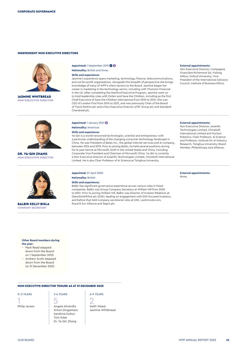 External appointments: Non-Executive Director, Compagnie Financière Richemont SA; Visiting Fellow, Oxford University; Vice- President of the International Advisory Council, Institute of Business Ethics. JASMINE WHITBREAD NON-EXECUTIVE DIRECTOR Appointed: 1 September 2019 Nationality: British and Swiss Skills and experience: Jasmine’s experience spans marketing, technology, finance, telecommunications, and not-for-profit organisations. Alongside this breadth of perspective she brings knowledge of many of WPP’s client sectors to the Board. Jasmine began her career in marketing in the technology sector, including with Thomson Financial in the US. After completing the Stanford Executive Program, Jasmine went on to hold leadership roles with Oxfam and Save the Children, including as the first Chief Executive of Save the Children International from 2010 to 2015. She was CEO of London First from 2016 to 2021, and was previously Chair of the Board of Travis Perkins plc and a Non-Executive Director of BT Group plc and Standard Chartered plc. External appointments: Non-Executive Director, AsiaInfo Technologies Limited, ChinaSoft International Limited and Horizon Robotics; Chair Professor, AI Science and Professor, Institute for AI Industry Research, Tsinghua University; Board Member, Philanthropy Asia Alliance. DR. YA-QIN ZHANG NON-EXECUTIVE DIRECTOR Appointed: 1 January 2021   Nationality: American Skills and experience: Ya-Qin is a world-renowned technologist, scientist and entrepreneur with a particular understanding of the changing consumer technology landscape in China. He was President of Baidu Inc., the global internet services and AI company, between 2014 and 2019. Prior to joining Baidu, he held several positions during his 16-year tenure at Microsoft, both in the United States and China, including Corporate Vice President and Chairman of Microsoft China. Ya-Qin is currently a Non-Executive Director of AsiaInfo Technologies Limited, ChinaSoft International Limited. He is also Chair Professor of AI Science at Tsinghua University. INDEPENDENT NON-EXECUTIVE DIRECTORS External appointments: None. BALBIR KELLY-BISLA COMPANY SECRETARY Appointed: 27 April 2020 Nationality: British Skills and experience: Balbir has significant governance experience across various roles in listed companies. Balbir was Group Company Secretary at William Hill from 2020 to 2021. Prior to joining William Hill, Balbir was Director of Investor Relations at GlaxoSmithKline plc (GSK), leading on engagement with ESG‑focused investors, and before that held company secretarial roles at GSK, Lastminute.com, Royal & Sun Alliance and Segro plc. NON-EXECUTIVE DIRECTOR TENURE AS AT 31 DECEMBER 2025 0-3 YEARS 1 Philip Jansen 3-6 YEARS 5 Angela Ahrendts Simon Dingemans Sandrine Dufour Tom Ilube Dr. Ya-Qin Zhang 6-9 YEARS 2 Keith Weed Jasmine Whitbread Other Board members during the year: – Mark Read stepped down from the Board on 1 September 2025 – Andrew Scott stepped down from the Board on 31 December 2025 Our Board WPP ANNUAL REPORT 2025 68 CORPORATE GOVERNANCE