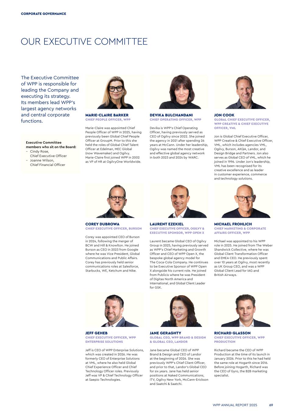 OUR EXECUTIVE COMMITTEE DEVIKA BULCHANDANI CHIEF OPERATING OFFICER, WPP Devika is WPP’s Chief Operating Officer, having previously served as CEO of Ogilvy since 2022. She joined the agency in 2021 after spending 26 years at McCann. Under her leadership, Ogilvy was named the most creative and effective global agency network in both 2023 and 2024 by WARC. The Executive Committee of WPP is responsible for leading the Company and executing its strategy. Its members lead WPP’s largest agency networks and central corporate functions. MARIE-CLAIRE BARKER CHIEF PEOPLE OFFICER, WPP Marie-Claire was appointed Chief People Officer of WPP in 2025, having previously been Global Chief People Officer at GroupM. Prior to this she held the roles of Global Chief Talent Officer at Edelman, MEC Global (now Wavemaker) and Ogilvy. Marie-Claire first joined WPP in 2002 as VP of HR at OgilvyOne Worldwide. MICHAEL FROHLICH CHIEF MARKETING & CORPORATE AFFAIRS OFFICER, WPP Michael was appointed to his WPP role in 2025. He joined from The Weber Shandwick Collective, where he was Global Client Transformation Officer and EMEA CEO. He previously spent over 10 years at Ogilvy, most recently as UK Group CEO, and was a WPP Global Client Lead for IAG and British Airways. Executive Committee members who sit on the Board: – Cindy Rose, Chief Executive Officer – Joanne Wilson, Chief Financial Officer JANE GERAGHTY GLOBAL CEO, WPP BRAND & DESIGN & GLOBAL CEO, LANDOR Jane became Global CEO of WPP Brand & Design and CEO of Landor at the beginning of 2026. She was previously WPP’s Chief Client Officer, and prior to that, Landor’s Global CEO for six years. Jane has held senior positions at Naked Communications, ITV, Ogilvy New York, McCann-Erickson and Saatchi & Saatchi. JEFF GEHEB CHIEF EXECUTIVE OFFICER, WPP ENTERPRISE SOLUTIONS Jeff is CEO of WPP Enterprise Solutions, which was created in 2026. He was formerly CEO of Enterprise Solutions at VML, where he also held Global Chief Experience Officer and Chief Technology Officer roles. Previously Jeff was VP & Chief Technology Officer at Saepio Technologies. JON COOK GLOBAL CHIEF EXECUTIVE OFFICER, WPP CREATIVE & CHIEF EXECUTIVE OFFICER, VML Jon is Global Chief Executive Officer, WPP Creative & Chief Executive Officer, VML, which includes agencies VML, Ogilvy, Burson, AKQA, Landor, and Design Bridge and Partners. Jon also serves as Global CEO of VML, which he joined in 1996. Under Jon’s leadership, VML has been recognised for its creative excellence and as leader in customer experience, commerce and technology solutions. COREY DUBROWA CHIEF EXECUTIVE OFFICER, BURSON Corey was appointed CEO of Burson in 2024, following the merger of BCW and Hill & Knowlton. He joined Burson as CEO in 2023 from Google where he was Vice President, Global Communications and Public Affairs. Corey has previously held senior communications roles at Salesforce, Starbucks, WE, Ketchum and Nike. RICHARD GLASSON CHIEF EXECUTIVE OFFICER, WPP PRODUCTION Richard became the CEO of WPP Production at the time of its launch in January 2026. Prior to this he had held the same role at Hogarth since 2016. Before joining Hogarth, Richard was the CEO of Gyro, the B2B marketing specialist. LAURENT EZEKIEL CHIEF EXECUTIVE OFFICER, OGILVY & EXECUTIVE SPONSOR, WPP OPEN X Laurent became Global CEO of Ogilvy Group in 2025, having previously served as WPP’s Chief Marketing and Growth Officer and CEO of WPP Open X, the bespoke global agency model for The Coca-Cola Company. He continues to be Executive Sponsor of WPP Open X alongside his current role. He joined from Publicis where he was President of Digitas North America and International, and Global Client Leader for GSK. WPP ANNUAL REPORT 2025 69 CORPORATE GOVERNANCE