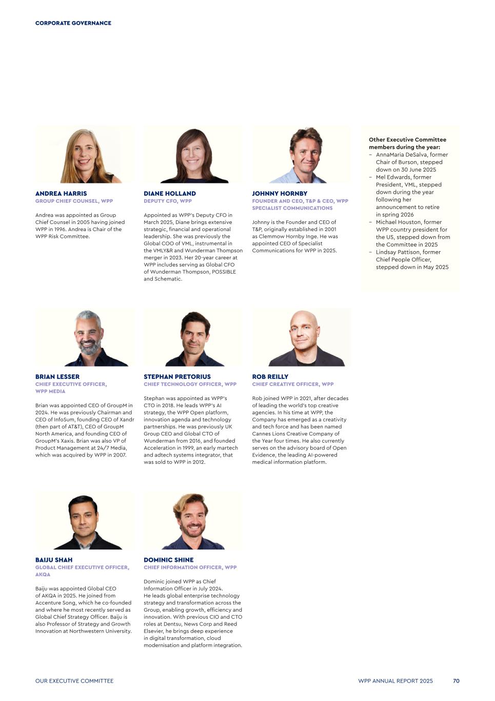 Other Executive Committee members during the year: – AnnaMaria DeSalva, former Chair of Burson, stepped down on 30 June 2025 – Mel Edwards, former President, VML, stepped down during the year following her announcement to retire in spring 2026 – Michael Houston, former WPP country president for the US, stepped down from the Committee in 2025 – Lindsay Pattison, former Chief People Officer, stepped down in May 2025 DIANE HOLLAND DEPUTY CFO, WPP Appointed as WPP’s Deputy CFO in March 2025, Diane brings extensive strategic, financial and operational leadership. She was previously the Global COO of VML, instrumental in the VMLY&R and Wunderman Thompson merger in 2023. Her 20-year career at WPP includes serving as Global CFO of Wunderman Thompson, POSSIBLE and Schematic. STEPHAN PRETORIUS CHIEF TECHNOLOGY OFFICER, WPP Stephan was appointed as WPP’s CTO in 2018. He leads WPP’s AI strategy, the WPP Open platform, innovation agenda and technology partnerships. He was previously UK Group CEO and Global CTO of Wunderman from 2016, and founded Acceleration in 1999, an early martech and adtech systems integrator, that was sold to WPP in 2012. ROB REILLY CHIEF CREATIVE OFFICER, WPP Rob joined WPP in 2021, after decades of leading the world's top creative agencies. In his time at WPP, the Company has emerged as a creativity and tech force and has been named Cannes Lions Creative Company of the Year four times. He also currently serves on the advisory board of Open Evidence, the leading AI-powered medical information platform. DOMINIC SHINE CHIEF INFORMATION OFFICER, WPP Dominic joined WPP as Chief Information Officer in July 2024. He leads global enterprise technology strategy and transformation across the Group, enabling growth, efficiency and innovation. With previous CIO and CTO roles at Dentsu, News Corp and Reed Elsevier, he brings deep experience in digital transformation, cloud modernisation and platform integration. JOHNNY HORNBY FOUNDER AND CEO, T&P & CEO, WPP SPECIALIST COMMUNICATIONS Johnny is the Founder and CEO of T&P, originally established in 2001 as Clemmow Hornby Inge. He was appointed CEO of Specialist Communications for WPP in 2025. BRIAN LESSER CHIEF EXECUTIVE OFFICER, WPP MEDIA Brian was appointed CEO of GroupM in 2024. He was previously Chairman and CEO of InfoSum, founding CEO of Xandr (then part of AT&T), CEO of GroupM North America, and founding CEO of GroupM’s Xaxis. Brian was also VP of Product Management at 24/7 Media, which was acquired by WPP in 2007. BAIJU SHAH GLOBAL CHIEF EXECUTIVE OFFICER, AKQA Baiju was appointed Global CEO of AKQA in 2025. He joined from Accenture Song, which he co-founded and where he most recently served as Global Chief Strategy Officer. Baiju is also Professor of Strategy and Growth Innovation at Northwestern University. ANDREA HARRIS GROUP CHIEF COUNSEL, WPP Andrea was appointed as Group Chief Counsel in 2005 having joined WPP in 1996. Andrea is Chair of the WPP Risk Committee. Our Executive Committee WPP ANNUAL REPORT 2025 70 CORPORATE GOVERNANCE