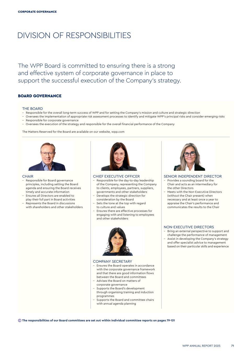DIVISION OF RESPONSIBILITIES BOARD GOVERNANCE THE BOARD – Responsible for the overall long-term success of WPP and for setting the Company’s mission and culture and strategic direction – Oversees the implementation of appropriate risk assessment processes to identify and mitigate WPP’s principal risks and consider emerging risks – Responsible for corporate governance – Oversees the execution of the strategy and responsible for the overall financial performance of the Company The Matters Reserved for the Board are available on our website, wpp.com CHAIR – Responsible for Board governance principles, including setting the Board agenda and ensuring the Board receives timely and accurate information – Ensures all Directors are enabled to play their full part in Board activities – Represents the Board in discussions with shareholders and other stakeholders CHIEF EXECUTIVE OFFICER – Responsible for the day-to-day leadership of the Company, representing the Company to clients, employees, partners, suppliers, governments and other stakeholders – Develops the strategic direction for consideration by the Board – Sets the tone at the top with regard to culture and values – Ensures there are effective processes for engaging with and listening to employees and other stakeholders SENIOR INDEPENDENT DIRECTOR – Provides a sounding board for the Chair and acts as an intermediary for the other Directors – Meets with the Non-Executive Directors (without the Chair present) when necessary and at least once a year to appraise the Chair’s performance and communicates the results to the Chair COMPANY SECRETARY – Ensures the Board operates in accordance with the corporate governance framework and that there are good information flows between the Board and committees – Advises the Board on matters of corporate governance – Supports the Board’s development through organising training and induction programmes – Supports the Board and committee chairs with annual agenda planning NON-EXECUTIVE DIRECTORS – Bring an external perspective to support and challenge the performance of management – Assist in developing the Company’s strategy and offer specialist advice to management based on their particular skills and experience The responsibilities of our Board committees are set out within individual committee reports on pages 79-131 The WPP Board is committed to ensuring there is a strong and effective system of corporate governance in place to support the successful execution of the Company’s strategy. WPP ANNUAL REPORT 2025 71 CORPORATE GOVERNANCE