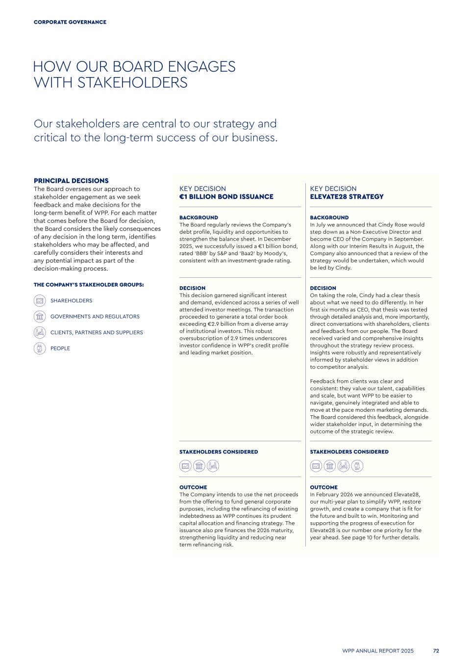 HOW OUR BOARD ENGAGES WITH STAKEHOLDERS Our stakeholders are central to our strategy and critical to the long-term success of our business. PRINCIPAL DECISIONS The Board oversees our approach to stakeholder engagement as we seek feedback and make decisions for the long-term benefit of WPP. For each matter that comes before the Board for decision, the Board considers the likely consequences of any decision in the long term, identifies stakeholders who may be affected, and carefully considers their interests and any potential impact as part of the decision-making process. THE COMPANY’S STAKEHOLDER GROUPS: SHAREHOLDERS GOVERNMENTS AND REGULATORS CLIENTS, PARTNERS AND SUPPLIERS PEOPLE KEY DECISION €1 BILLION BOND ISSUANCE KEY DECISION ELEVATE28 STRATEGY BACKGROUND The Board regularly reviews the Company’s debt profile, liquidity and opportunities to strengthen the balance sheet. In December 2025, we successfully issued a €1 billion bond, rated ‘BBB’ by S&P and ‘Baa2’ by Moody’s, consistent with an investment-grade rating. BACKGROUND In July we announced that Cindy Rose would step down as a Non-Executive Director and become CEO of the Company in September. Along with our Interim Results in August, the Company also announced that a review of the strategy would be undertaken, which would be led by Cindy. DECISION This decision garnered significant interest and demand, evidenced across a series of well attended investor meetings. The transaction proceeded to generate a total order book exceeding €2.9 billion from a diverse array of institutional investors. This robust oversubscription of 2.9 times underscores investor confidence in WPP’s credit profile and leading market position. DECISION On taking the role, Cindy had a clear thesis about what we need to do differently. In her first six months as CEO, that thesis was tested through detailed analysis and, more importantly, direct conversations with shareholders, clients and feedback from our people. The Board received varied and comprehensive insights throughout the strategy review process. Insights were robustly and representatively informed by stakeholder views in addition to competitor analysis. Feedback from clients was clear and consistent: they value our talent, capabilities and scale, but want WPP to be easier to navigate, genuinely integrated and able to move at the pace modern marketing demands. The Board considered this feedback, alongside wider stakeholder input, in determining the outcome of the strategic review. STAKEHOLDERS CONSIDERED STAKEHOLDERS CONSIDERED OUTCOME The Company intends to use the net proceeds from the offering to fund general corporate purposes, including the refinancing of existing indebtedness as WPP continues its prudent capital allocation and financing strategy. The issuance also pre finances the 2026 maturity, strengthening liquidity and reducing near term refinancing risk. OUTCOME In February 2026 we announced Elevate28, our multi‑year plan to simplify WPP, restore growth, and create a company that is fit for the future and built to win. Monitoring and supporting the progress of execution for Elevate28 is our number one priority for the year ahead. See page 10 for further details. WPP ANNUAL REPORT 2025 72 CORPORATE GOVERNANCE