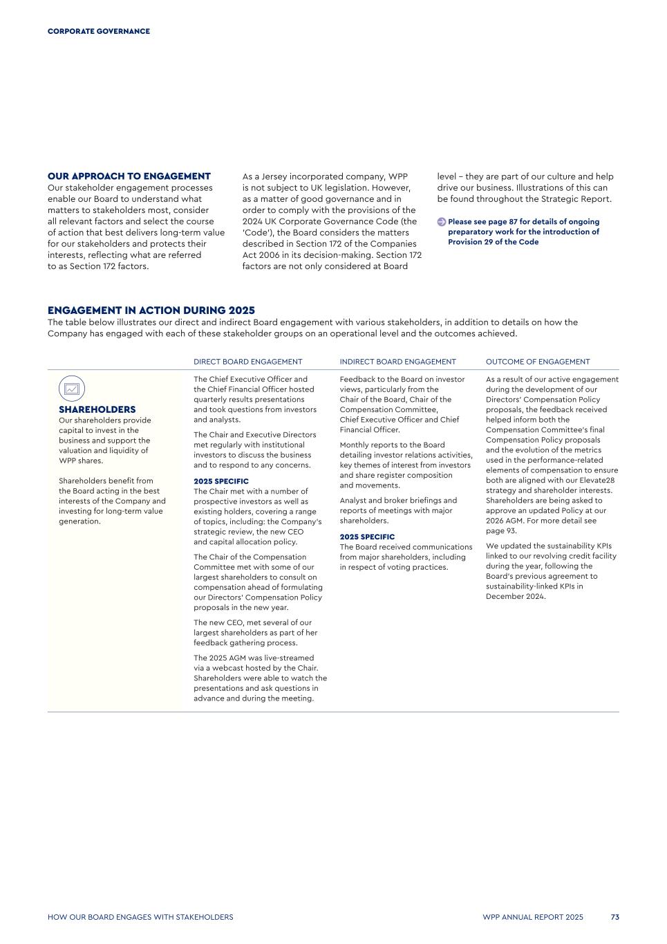 OUR APPROACH TO ENGAGEMENT Our stakeholder engagement processes enable our Board to understand what matters to stakeholders most, consider all relevant factors and select the course of action that best delivers long-term value for our stakeholders and protects their interests, reflecting what are referred to as Section 172 factors. As a Jersey incorporated company, WPP is not subject to UK legislation. However, as a matter of good governance and in order to comply with the provisions of the 2024 UK Corporate Governance Code (the 'Code’), the Board considers the matters described in Section 172 of the Companies Act 2006 in its decision-making. Section 172 factors are not only considered at Board level – they are part of our culture and help drive our business. Illustrations of this can be found throughout the Strategic Report. Please see page 87 for details of ongoing preparatory work for the introduction of Provision 29 of the Code ENGAGEMENT IN ACTION DURING 2025 The table below illustrates our direct and indirect Board engagement with various stakeholders, in addition to details on how the Company has engaged with each of these stakeholder groups on an operational level and the outcomes achieved. DIRECT BOARD ENGAGEMENT INDIRECT BOARD ENGAGEMENT OUTCOME OF ENGAGEMENT SHAREHOLDERS Our shareholders provide capital to invest in the business and support the valuation and liquidity of WPP shares. Shareholders benefit from the Board acting in the best interests of the Company and investing for long-term value generation. The Chief Executive Officer and the Chief Financial Officer hosted quarterly results presentations and took questions from investors and analysts. The Chair and Executive Directors met regularly with institutional investors to discuss the business and to respond to any concerns. 2025 SPECIFIC The Chair met with a number of prospective investors as well as existing holders, covering a range of topics, including: the Company’s strategic review, the new CEO and capital allocation policy. The Chair of the Compensation Committee met with some of our largest shareholders to consult on compensation ahead of formulating our Directors’ Compensation Policy proposals in the new year. The new CEO, met several of our largest shareholders as part of her feedback gathering process. The 2025 AGM was live-streamed via a webcast hosted by the Chair. Shareholders were able to watch the presentations and ask questions in advance and during the meeting. Feedback to the Board on investor views, particularly from the Chair of the Board, Chair of the Compensation Committee, Chief Executive Officer and Chief Financial Officer. Monthly reports to the Board detailing investor relations activities, key themes of interest from investors and share register composition and movements. Analyst and broker briefings and reports of meetings with major shareholders. 2025 SPECIFIC The Board received communications from major shareholders, including in respect of voting practices. As a result of our active engagement during the development of our Directors’ Compensation Policy proposals, the feedback received helped inform both the Compensation Committee’s final Compensation Policy proposals and the evolution of the metrics used in the performance-related elements of compensation to ensure both are aligned with our Elevate28 strategy and shareholder interests. Shareholders are being asked to approve an updated Policy at our 2026 AGM. For more detail see page 93. We updated the sustainability KPIs linked to our revolving credit facility during the year, following the Board’s previous agreement to sustainability-linked KPIs in December 2024. How our Board engages WITH STAKEHOLDERS WPP ANNUAL REPORT 2025 73 CORPORATE GOVERNANCE