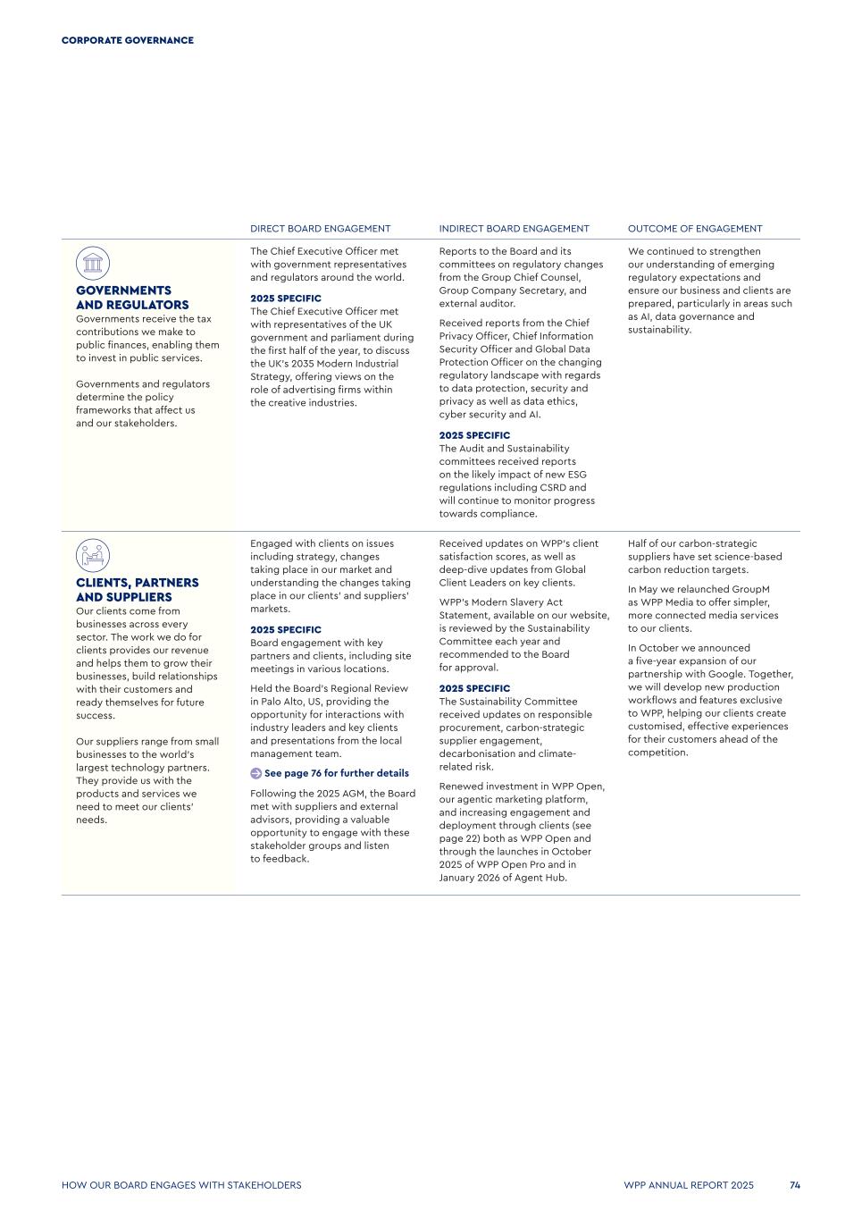 DIRECT BOARD ENGAGEMENT INDIRECT BOARD ENGAGEMENT OUTCOME OF ENGAGEMENT GOVERNMENTS AND REGULATORS Governments receive the tax contributions we make to public finances, enabling them to invest in public services. Governments and regulators determine the policy frameworks that affect us and our stakeholders. The Chief Executive Officer met with government representatives and regulators around the world. 2025 SPECIFIC The Chief Executive Officer met with representatives of the UK government and parliament during the first half of the year, to discuss the UK’s 2035 Modern Industrial Strategy, offering views on the role of advertising firms within the creative industries. Reports to the Board and its committees on regulatory changes from the Group Chief Counsel, Group Company Secretary, and external auditor. Received reports from the Chief Privacy Officer, Chief Information Security Officer and Global Data Protection Officer on the changing regulatory landscape with regards to data protection, security and privacy as well as data ethics, cyber security and AI. 2025 SPECIFIC The Audit and Sustainability committees received reports on the likely impact of new ESG regulations including CSRD and will continue to monitor progress towards compliance. We continued to strengthen our understanding of emerging regulatory expectations and ensure our business and clients are prepared, particularly in areas such as AI, data governance and sustainability. CLIENTS, PARTNERS AND SUPPLIERS Our clients come from businesses across every sector. The work we do for clients provides our revenue and helps them to grow their businesses, build relationships with their customers and ready themselves for future success. Our suppliers range from small businesses to the world’s largest technology partners. They provide us with the products and services we need to meet our clients’ needs. Engaged with clients on issues including strategy, changes taking place in our market and understanding the changes taking place in our clients’ and suppliers’ markets. 2025 SPECIFIC Board engagement with key partners and clients, including site meetings in various locations. Held the Board’s Regional Review in Palo Alto, US, providing the opportunity for interactions with industry leaders and key clients and presentations from the local management team. See page 76 for further details Following the 2025 AGM, the Board met with suppliers and external advisors, providing a valuable opportunity to engage with these stakeholder groups and listen to feedback. Received updates on WPP’s client satisfaction scores, as well as deep-dive updates from Global Client Leaders on key clients. WPP’s Modern Slavery Act Statement, available on our website, is reviewed by the Sustainability Committee each year and recommended to the Board for approval. 2025 SPECIFIC The Sustainability Committee received updates on responsible procurement, carbon-strategic supplier engagement, decarbonisation and climate- related risk. Renewed investment in WPP Open, our agentic marketing platform, and increasing engagement and deployment through clients (see page 22) both as WPP Open and through the launches in October 2025 of WPP Open Pro and in January 2026 of Agent Hub. Half of our carbon-strategic suppliers have set science-based carbon reduction targets. In May we relaunched GroupM as WPP Media to offer simpler, more connected media services to our clients. In October we announced a five-year expansion of our partnership with Google. Together, we will develop new production workflows and features exclusive to WPP, helping our clients create customised, effective experiences for their customers ahead of the competition. How our Board engages WITH STAKEHOLDERS WPP ANNUAL REPORT 2025 74 CORPORATE GOVERNANCE