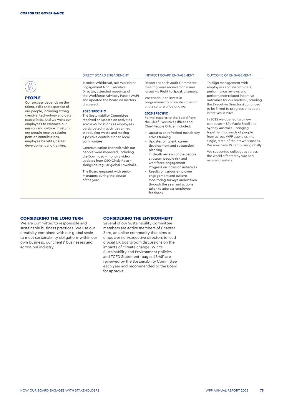 DIRECT BOARD ENGAGEMENT INDIRECT BOARD ENGAGEMENT OUTCOME OF ENGAGEMENT PEOPLE Our success depends on the talent, skills and expertise of our people, including strong creative, technology and data capabilities. And we want our employees to embrace our mission and culture. In return, our people receive salaries, pension contributions, employee benefits, career development and training. Jasmine Whitbread, our Workforce Engagement Non-Executive Director, attended meetings of the Workforce Advisory Panel (WAP) and updated the Board on matters discussed. 2025 SPECIFIC The Sustainability Committee received an update on activities across 45 locations as employees participated in activities aimed at reducing waste and making a positive contribution to local communities. Communication channels with our people were improved, including the Download - monthly video updates from CEO Cindy Rose - alongside regular global Townhalls. The Board engaged with senior managers during the course of the year. Reports at each Audit Committee meeting were received on issues raised via Right to Speak channels. We continue to invest in programmes to promote inclusion and a culture of belonging. 2025 SPECIFIC Formal reports to the Board from the Chief Executive Officer and Chief People Officer included: – Updates on refreshed mandatory ethics training – Updates on talent, career development and succession planning – In-depth reviews of the people strategy, people risk and workforce engagement – Progress on inclusion initiatives – Results of various employee engagement and culture monitoring surveys undertaken through the year and actions taken to address employee feedback To align management with employees and shareholders, performance reviews and performance-related incentive outcomes for our leaders (including the Executive Directors) continued to be linked to progress on people initiatives in 2025. In 2025 we opened two new campuses - São Paulo Brazil and Sydney Australia - bringing together thousands of people from across WPP agencies into single, state-of-the-art workspaces. We now have 49 campuses globally. We supported colleagues across the world affected by war and natural disasters. CONSIDERING THE LONG TERM We are committed to responsible and sustainable business practices. We use our creativity combined with our global scale to meet sustainability obligations within our own business, our clients’ businesses and across our industry. CONSIDERING THE ENVIRONMENT Several of our Sustainability Committee members are active members of Chapter Zero, an online community that aims to empower non-executive directors to lead crucial UK boardroom discussions on the impacts of climate change. WPP’s Sustainability and Environment policies and TCFD Statement (pages 43-48) are reviewed by the Sustainability Committee each year and recommended to the Board for approval. How our Board engages WITH STAKEHOLDERS WPP ANNUAL REPORT 2025 75 CORPORATE GOVERNANCE