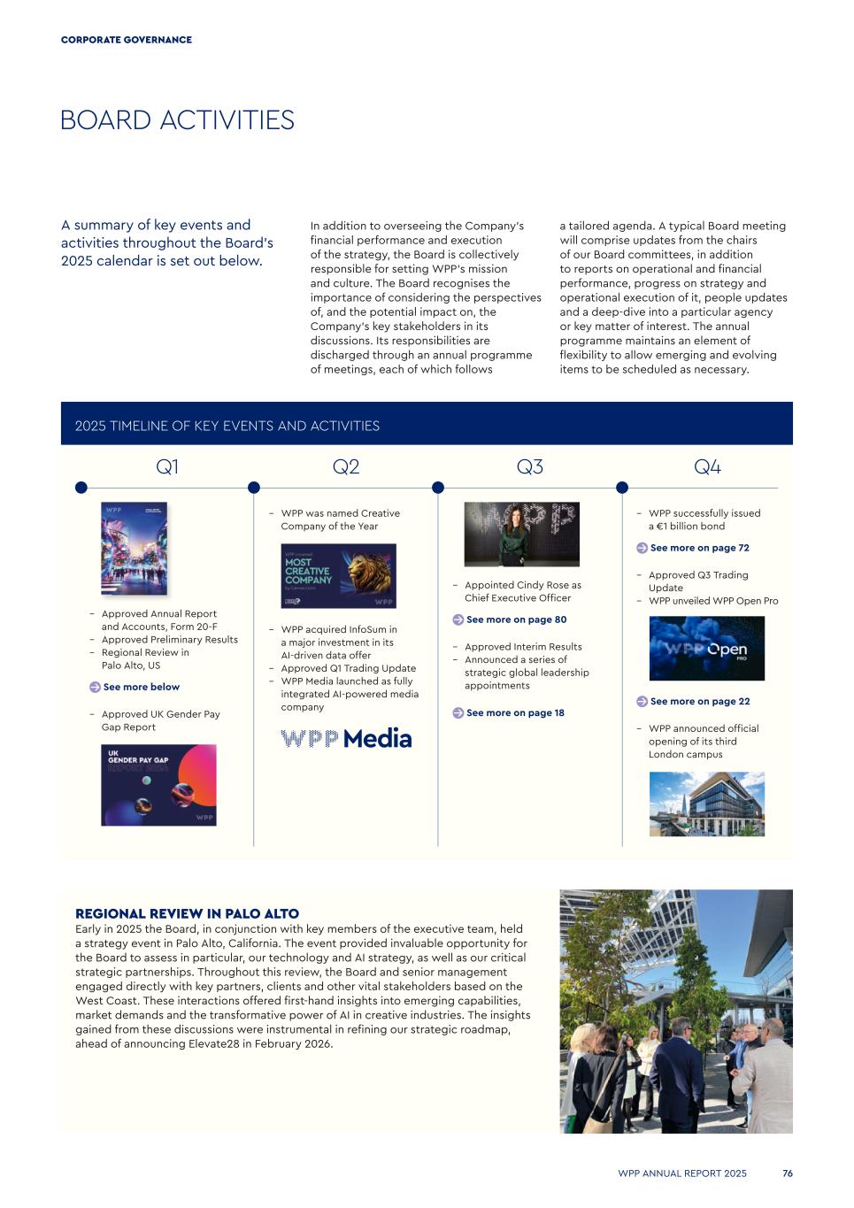 BOARD ACTIVITIES REGIONAL REVIEW IN PALO ALTO Early in 2025 the Board, in conjunction with key members of the executive team, held a strategy event in Palo Alto, California. The event provided invaluable opportunity for the Board to assess in particular, our technology and AI strategy, as well as our critical strategic partnerships. Throughout this review, the Board and senior management engaged directly with key partners, clients and other vital stakeholders based on the West Coast. These interactions offered first-hand insights into emerging capabilities, market demands and the transformative power of AI in creative industries. The insights gained from these discussions were instrumental in refining our strategic roadmap, ahead of announcing Elevate28 in February 2026. – Approved Annual Report and Accounts, Form 20-F – Approved Preliminary Results – Regional Review in Palo Alto, US See more below – Approved UK Gender Pay Gap Report – WPP was named Creative Company of the Year – WPP acquired InfoSum in a major investment in its AI-driven data offer – Approved Q1 Trading Update – WPP Media launched as fully integrated AI-powered media company – Appointed Cindy Rose as Chief Executive Officer See more on page 80 – Approved Interim Results – Announced a series of strategic global leadership appointments See more on page 18 – WPP successfully issued a €1 billion bond See more on page 72 – Approved Q3 Trading Update – WPP unveiled WPP Open Pro See more on page 22 – WPP announced official opening of its third London campus 2025 TIMELINE OF KEY EVENTS AND ACTIVITIES Q1 Q2 Q3 Q4 A summary of key events and activities throughout the Board’s 2025 calendar is set out below. In addition to overseeing the Company's financial performance and execution of the strategy, the Board is collectively responsible for setting WPP's mission and culture. The Board recognises the importance of considering the perspectives of, and the potential impact on, the Company’s key stakeholders in its discussions. Its responsibilities are discharged through an annual programme of meetings, each of which follows a tailored agenda. A typical Board meeting will comprise updates from the chairs of our Board committees, in addition to reports on operational and financial performance, progress on strategy and operational execution of it, people updates and a deep-dive into a particular agency or key matter of interest. The annual programme maintains an element of flexibility to allow emerging and evolving items to be scheduled as necessary. ANNUAL REPORT & ACCOUNTS 2024 1_IFC_Contents_At_A_Glance_v181.indd 1 27/03/2025 11:06 WPP ANNUAL REPORT 2025 76 CORPORATE GOVERNANCE