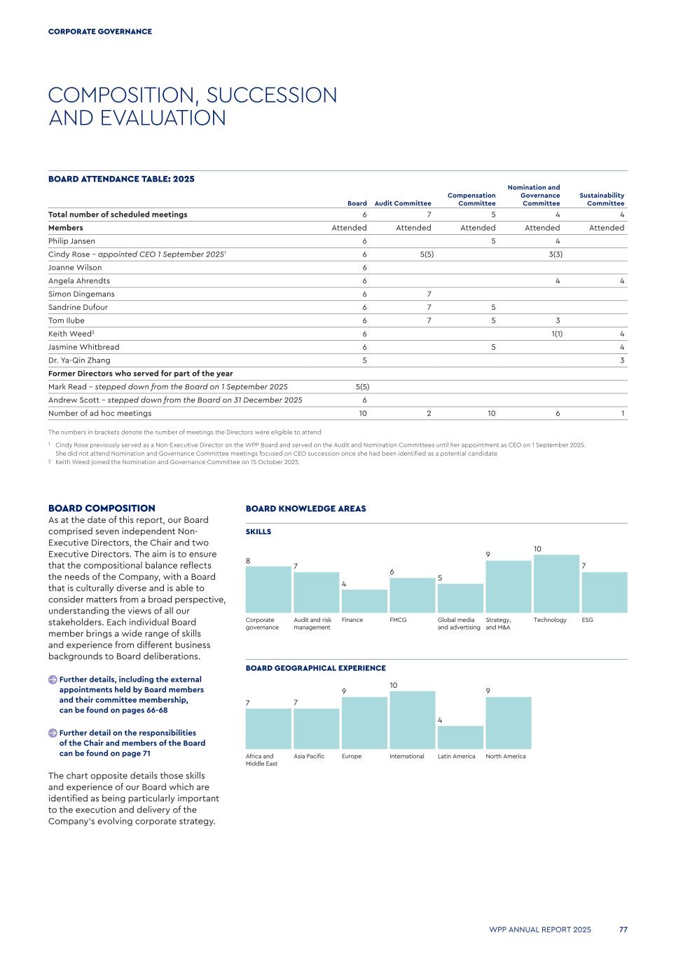 Global media and advertising Audit and risk management Strategy, and M&A FMCG Technology ESGCorporate governance Finance 8 7 4 6 5 9 10 7 Latin AmericaAsia Pacific North AmericaInternationalAfrica and Middle East Europe 7 7 9 10 4 9 COMPOSITION, SUCCESSION AND EVALUATION Board Audit Committee Compensation Committee Nomination and Governance Committee Sustainability Committee Total number of scheduled meetings 6 7 5 4 4 Members Attended Attended Attended Attended Attended Philip Jansen 6 5 4 Cindy Rose – appointed CEO 1 September 20251 6 5(5)   3(3) Joanne Wilson 6 Angela Ahrendts 6 4 4 Simon Dingemans 6 7 Sandrine Dufour 6 7 5 Tom Ilube 6 7 5 3 Keith Weed2 6 1(1) 4 Jasmine Whitbread 6 5 4 Dr. Ya-Qin Zhang 5 3 Former Directors who served for part of the year Mark Read – stepped down from the Board on 1 September 2025 5(5) Andrew Scott – stepped down from the Board on 31 December 2025 6 Number of ad hoc meetings 10 2 10 6 1 The numbers in brackets denote the number of meetings the Directors were eligible to attend 1 Cindy Rose previously served as a Non-Executive Director on the WPP Board and served on the Audit and Nomination Committees until her appointment as CEO on 1 September 2025. She did not attend Nomination and Governance Committee meetings focused on CEO succession once she had been identified as a potential candidate 2 Keith Weed joined the Nomination and Governance Committee on 15 October 2025 BOARD COMPOSITION As at the date of this report, our Board comprised seven independent Non- Executive Directors, the Chair and two Executive Directors. The aim is to ensure that the compositional balance reflects the needs of the Company, with a Board that is culturally diverse and is able to consider matters from a broad perspective, understanding the views of all our stakeholders. Each individual Board member brings a wide range of skills and experience from different business backgrounds to Board deliberations. Further details, including the external appointments held by Board members and their committee membership, can be found on pages 66-68 Further detail on the responsibilities of the Chair and members of the Board can be found on page 71 The chart opposite details those skills and experience of our Board which are identified as being particularly important to the execution and delivery of the Company’s evolving corporate strategy. SKILLS BOARD KNOWLEDGE AREAS BOARD GEOGRAPHICAL EXPERIENCE BOARD ATTENDANCE TABLE: 2025 WPP ANNUAL REPORT 2025 77 CORPORATE GOVERNANCE