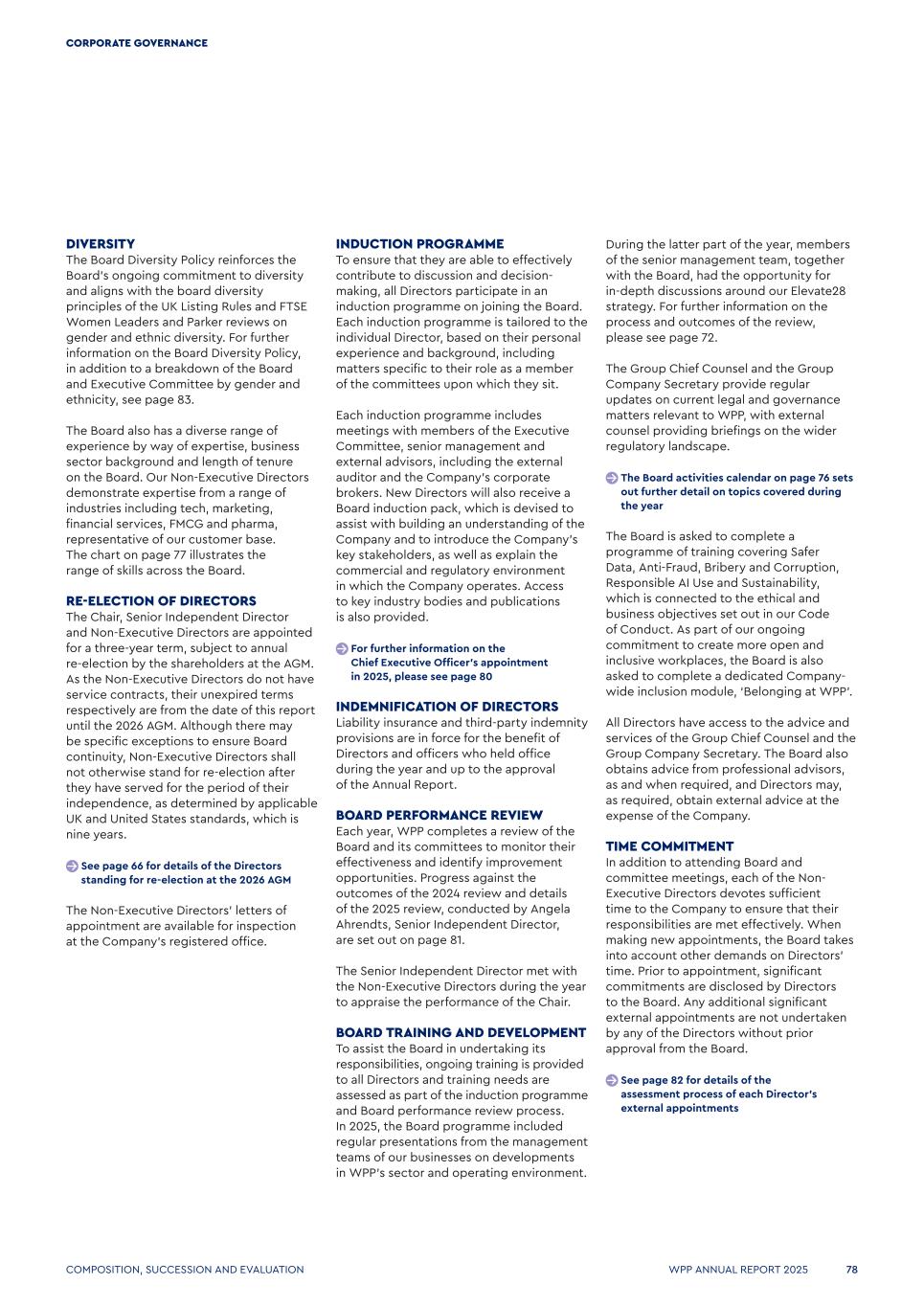 DIVERSITY The Board Diversity Policy reinforces the Board’s ongoing commitment to diversity and aligns with the board diversity principles of the UK Listing Rules and FTSE Women Leaders and Parker reviews on gender and ethnic diversity. For further information on the Board Diversity Policy, in addition to a breakdown of the Board and Executive Committee by gender and ethnicity, see page 83. The Board also has a diverse range of experience by way of expertise, business sector background and length of tenure on the Board. Our Non-Executive Directors demonstrate expertise from a range of industries including tech, marketing, financial services, FMCG and pharma, representative of our customer base. The chart on page 77 illustrates the range of skills across the Board. RE-ELECTION OF DIRECTORS The Chair, Senior Independent Director and Non-Executive Directors are appointed for a three-year term, subject to annual re-election by the shareholders at the AGM. As the Non-Executive Directors do not have service contracts, their unexpired terms respectively are from the date of this report until the 2026 AGM. Although there may be specific exceptions to ensure Board continuity, Non-Executive Directors shall not otherwise stand for re-election after they have served for the period of their independence, as determined by applicable UK and United States standards, which is nine years. See page 66 for details of the Directors standing for re-election at the 2026 AGM The Non-Executive Directors’ letters of appointment are available for inspection at the Company’s registered office. INDUCTION PROGRAMME To ensure that they are able to effectively contribute to discussion and decision- making, all Directors participate in an induction programme on joining the Board. Each induction programme is tailored to the individual Director, based on their personal experience and background, including matters specific to their role as a member of the committees upon which they sit. Each induction programme includes meetings with members of the Executive Committee, senior management and external advisors, including the external auditor and the Company’s corporate brokers. New Directors will also receive a Board induction pack, which is devised to assist with building an understanding of the Company and to introduce the Company’s key stakeholders, as well as explain the commercial and regulatory environment in which the Company operates. Access to key industry bodies and publications is also provided. For further information on the Chief Executive Officer’s appointment in 2025, please see page 80 INDEMNIFICATION OF DIRECTORS Liability insurance and third-party indemnity provisions are in force for the benefit of Directors and officers who held office during the year and up to the approval of the Annual Report. BOARD PERFORMANCE REVIEW Each year, WPP completes a review of the Board and its committees to monitor their effectiveness and identify improvement opportunities. Progress against the outcomes of the 2024 review and details of the 2025 review, conducted by Angela Ahrendts, Senior Independent Director, are set out on page 81. The Senior Independent Director met with the Non-Executive Directors during the year to appraise the performance of the Chair. BOARD TRAINING AND DEVELOPMENT To assist the Board in undertaking its responsibilities, ongoing training is provided to all Directors and training needs are assessed as part of the induction programme and Board performance review process. In 2025, the Board programme included regular presentations from the management teams of our businesses on developments in WPP’s sector and operating environment. During the latter part of the year, members of the senior management team, together with the Board, had the opportunity for in-depth discussions around our Elevate28 strategy. For further information on the process and outcomes of the review, please see page 72. The Group Chief Counsel and the Group Company Secretary provide regular updates on current legal and governance matters relevant to WPP, with external counsel providing briefings on the wider regulatory landscape. The Board activities calendar on page 76 sets out further detail on topics covered during the year The Board is asked to complete a programme of training covering Safer Data, Anti-Fraud, Bribery and Corruption, Responsible AI Use and Sustainability, which is connected to the ethical and business objectives set out in our Code of Conduct. As part of our ongoing commitment to create more open and inclusive workplaces, the Board is also asked to complete a dedicated Company- wide inclusion module, ‘Belonging at WPP’. All Directors have access to the advice and services of the Group Chief Counsel and the Group Company Secretary. The Board also obtains advice from professional advisors, as and when required, and Directors may, as required, obtain external advice at the expense of the Company. TIME COMMITMENT In addition to attending Board and committee meetings, each of the Non- Executive Directors devotes sufficient time to the Company to ensure that their responsibilities are met effectively. When making new appointments, the Board takes into account other demands on Directors’ time. Prior to appointment, significant commitments are disclosed by Directors to the Board. Any additional significant external appointments are not undertaken by any of the Directors without prior approval from the Board. See page 82 for details of the assessment process of each Director’s external appointments COMPOSITION, SUCCESSION AND evaluation WPP ANNUAL REPORT 2025 78 CORPORATE GOVERNANCE