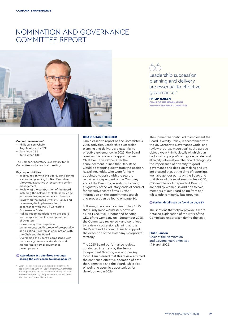 Committee members* – Philip Jansen (Chair) – Angela Ahrendts DBE – Tom Ilube CBE – Keith Weed CBE The Company Secretary is Secretary to the Committee and attends all meetings. Key responsibilities: – In conjunction with the Board, considering succession planning for Non-Executive Directors, Executive Directors and senior management – Reviewing the composition of the Board including the balance of skills, knowledge and expertise, experience and diversity – Reviewing the Board Diversity Policy and overseeing its implementation, in accordance with the UK Corporate Governance Code – Making recommendations to the Board for the appointment or reappointment of Directors – Considering other significant commitments and interests of prospective and existing Directors in conjunction with the Chair and the Board – Overseeing the Board’s compliance with corporate governance standards and monitoring external governance developments Attendance at Committee meetings during the year can be found on page 77 *  Cindy Rose served as a Committee member until her appointment as CEO on 1 September 2025. Committee meetings focused on CEO succession during the year were not attended by Cindy Rose once she had been identified as a potential candidate NOMINATION AND GOVERNANCE COMMITTEE REPORT DEAR SHAREHOLDER I am pleased to report on the Committee’s 2025 activities. Leadership succession planning and delivery are essential to effective governance. In 2025, the Board oversaw the process to appoint a new Chief Executive Officer after the announcement in June that Mark Read would be stepping down from the position. Russell Reynolds, who were formally appointed to assist with the search, remained independent of the Company and all the Directors, in addition to being a signatory of the voluntary code of conduct for executive search firms. Further information on the appointment search and process can be found on page 80. Following the announcement in July 2025 that Cindy Rose would step down as a Non-Executive Director and become CEO of the Company on 1 September 2025, the Committee reviewed - and continues to review - succession planning across the Board and its committees to support the execution of the Company’s corporate strategy. The 2025 Board performance review, conducted internally by the Senior Independent Director, was another key focus. I am pleased that this review affirmed the continued effective operation of both the Committee and the Board, while also pinpointing specific opportunities for development in 2026. The Committee continued to implement the Board Diversity Policy, in accordance with the UK Corporate Governance Code, and review progress made against the agreed objectives within it, details of which can be found on page 65, alongside gender and ethnicity information. The Board recognises the importance of diversity to good governance and decision-making and we are pleased that, at the time of reporting, we have gender parity on the Board and that three of the most senior roles – CEO, CFO and Senior Independent Director – are held by women, in addition to two members of our Board being from non- white ethnic minority backgrounds. Further details can be found on page 83 The sections that follow provide a more detailed explanation of the work of the Committee undertaken during the year. Philip Jansen Chair of the Nomination and Governance Committee 19 March 2026 Leadership succession planning and delivery are essential to effective governance.” PHILIP JANSEN CHAIR OF THE NOMINATION AND GOVERNANCE COMMITTEE WPP ANNUAL REPORT 2025 79 CORPORATE GOVERNANCE