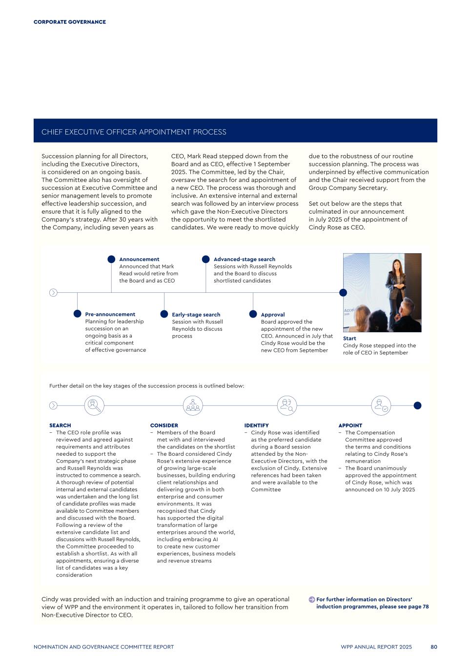 Further detail on the key stages of the succession process is outlined below: CHIEF EXECUTIVE OFFICER APPOINTMENT PROCESS Succession planning for all Directors, including the Executive Directors, is considered on an ongoing basis. The Committee also has oversight of succession at Executive Committee and senior management levels to promote effective leadership succession, and ensure that it is fully aligned to the Company’s strategy. After 30 years with the Company, including seven years as CEO, Mark Read stepped down from the Board and as CEO, effective 1 September 2025. The Committee, led by the Chair, oversaw the search for and appointment of a new CEO. The process was thorough and inclusive. An extensive internal and external search was followed by an interview process which gave the Non-Executive Directors the opportunity to meet the shortlisted candidates. We were ready to move quickly due to the robustness of our routine succession planning. The process was underpinned by effective communication and the Chair received support from the Group Company Secretary. Set out below are the steps that culminated in our announcement in July 2025 of the appointment of Cindy Rose as CEO. Cindy was provided with an induction and training programme to give an operational view of WPP and the environment it operates in, tailored to follow her transition from Non-Executive Director to CEO. For further information on Directors’ induction programmes, please see page 78 SEARCH – The CEO role profile was reviewed and agreed against requirements and attributes needed to support the Company’s next strategic phase and Russell Reynolds was instructed to commence a search. A thorough review of potential internal and external candidates was undertaken and the long list of candidate profiles was made available to Committee members and discussed with the Board. Following a review of the extensive candidate list and discussions with Russell Reynolds, the Committee proceeded to establish a shortlist. As with all appointments, ensuring a diverse list of candidates was a key consideration CONSIDER – Members of the Board met with and interviewed the candidates on the shortlist – The Board considered Cindy Rose’s extensive experience of growing large-scale businesses, building enduring client relationships and delivering growth in both enterprise and consumer environments. It was recognised that Cindy has supported the digital transformation of large enterprises around the world, including embracing AI to create new customer experiences, business models and revenue streams IDENTIFY – Cindy Rose was identified as the preferred candidate during a Board session attended by the Non- Executive Directors, with the exclusion of Cindy. Extensive references had been taken and were available to the Committee APPOINT – The Compensation Committee approved the terms and conditions relating to Cindy Rose’s remuneration – The Board unanimously approved the appointment of Cindy Rose, which was announced on 10 July 2025 Announcement Announced that Mark Read would retire from the Board and as CEO Early-stage search Session with Russell Reynolds to discuss process Advanced-stage search Sessions with Russell Reynolds and the Board to discuss shortlisted candidates Approval Board approved the appointment of the new CEO. Announced in July that Cindy Rose would be the new CEO from September Start Cindy Rose stepped into the role of CEO in September Pre-announcement Planning for leadership succession on an ongoing basis as a critical component of effective governance WPP ANNUAL REPORT 2025 80 CORPORATE GOVERNANCE NOMINATION AND GOVERNANCE COMMITTEE REPORT