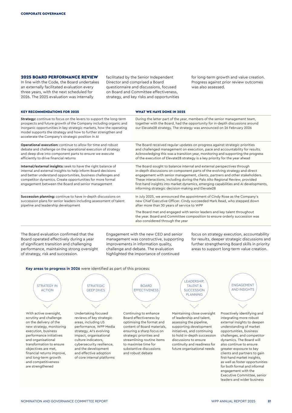 2025 BOARD PERFORMANCE REVIEW In line with the Code, the Board undertakes an externally facilitated evaluation every three years, with the next scheduled for 2026. The 2025 evaluation was internally facilitated by the Senior Independent Director and comprised a Board questionnaire and discussions, focused on Board and Committee effectiveness, strategy, and key risks and opportunities for long-term growth and value creation. Progress against prior review outcomes was also assessed. KEY RECOMMENDATIONS FOR 2025 WHAT WE HAVE DONE IN 2025 Strategy: continue to focus on the levers to support the long-term prospects and future growth of the Company including organic and inorganic opportunities in key strategic markets, how the operating model supports the strategy and how to further strengthen and accelerate the Company’s strategic position in AI During the latter part of the year, members of the senior management team, together with the Board, had the opportunity for in-depth discussions around our Elevate28 strategy. The strategy was announced on 26 February 2026 Operational execution: continue to allow for time and robust debate and challenge on the operational execution of strategy and deep dive into component parts to ensure we execute efficiently to drive financial returns The Board received regular updates on progress against strategic priorities and challenged management on execution, pace and accountability for results. Acknowledging this was a transition year, monitoring and supporting the progress of the execution of Elevate28 strategy is a key priority for the year ahead Internal/external insights: seek to have the right balance of internal and external insights to help inform Board decisions and better understand opportunities, business challenges and competitor dynamics. Create opportunities for more formal engagement between the Board and senior management The Board sought to balance internal and external perspectives through in‑depth discussions on component parts of the evolving strategy and direct engagement with senior management, clients, partners and other stakeholders. These interactions, including during the Palo Alto Regional Review, provided first‑hand insights into market dynamics, emerging capabilities and AI developments, informing strategic decision‑making and Elevate28 Succession planning: continue to have in-depth discussions on succession plans for senior leaders including assessment of talent pipeline and leadership development In July 2025, we announced the appointment of Cindy Rose as the Company’s new Chief Executive Officer. Cindy succeeded Mark Read, who stepped down after more than 30 years of service to WPP The Board met and engaged with senior leaders and key talent throughout the year. Board and Committee composition to ensure orderly succession was also considered through the year The Board evaluation confirmed that the Board operated effectively during a year of significant transition and challenging performance, maintaining strong oversight of strategy, risk and succession. Engagement with the new CEO and senior management was constructive, supporting improvements in information quality, challenge and debate. The evaluation highlighted the importance of continued focus on strategy execution, accountability for results, deeper strategic discussions and further strengthening Board skills in priority areas to support long-term value creation. Key areas to progress in 2026 were identified as part of this process: BOARD EFFECTIVENESS LEADERSHIP, TALENT & SUCCESSION PLANNING ENGAGEMENT AND INSIGHTS STRATEGIC DEEP DIVES STRATEGY IN ACTION With active oversight, scrutiny and challenge on the delivery of the new strategy, monitoring execution, business performance initiatives and organisational transformation to ensure objectives are met, financial returns improve, and long-term growth and competitiveness are strengthened Undertaking focused reviews of key strategic areas, including US performance, WPP Media strategy, AI’s evolving impact, organisational culture indicators, cybersecurity resilience, and the development and effective adoption of core internal platforms Continuing to enhance Board effectiveness by optimising the format and content of Board materials, ensuring a sharp focus on strategic priorities and streamlining routine items to maximise time for substantive discussions and robust debate Maintaining close oversight of leadership and talent, assessing the pipeline, supporting development initiatives, and continuing to hold in-depth succession discussions to ensure continuity and readiness for future organisational needs Proactively identifying and integrating more robust external insights to deepen understanding of market opportunities, business challenges, and competitor dynamics. The Board will also continue to ensure greater exposure to key clients and partners to gain first-hand market insights, as well as foster opportunities for both formal and informal engagement with the Executive Committee, senior leaders and wider business WPP ANNUAL REPORT 2025 81 CORPORATE GOVERNANCE NOMINATION AND GOVERNANCE COMMITTEE REPORT