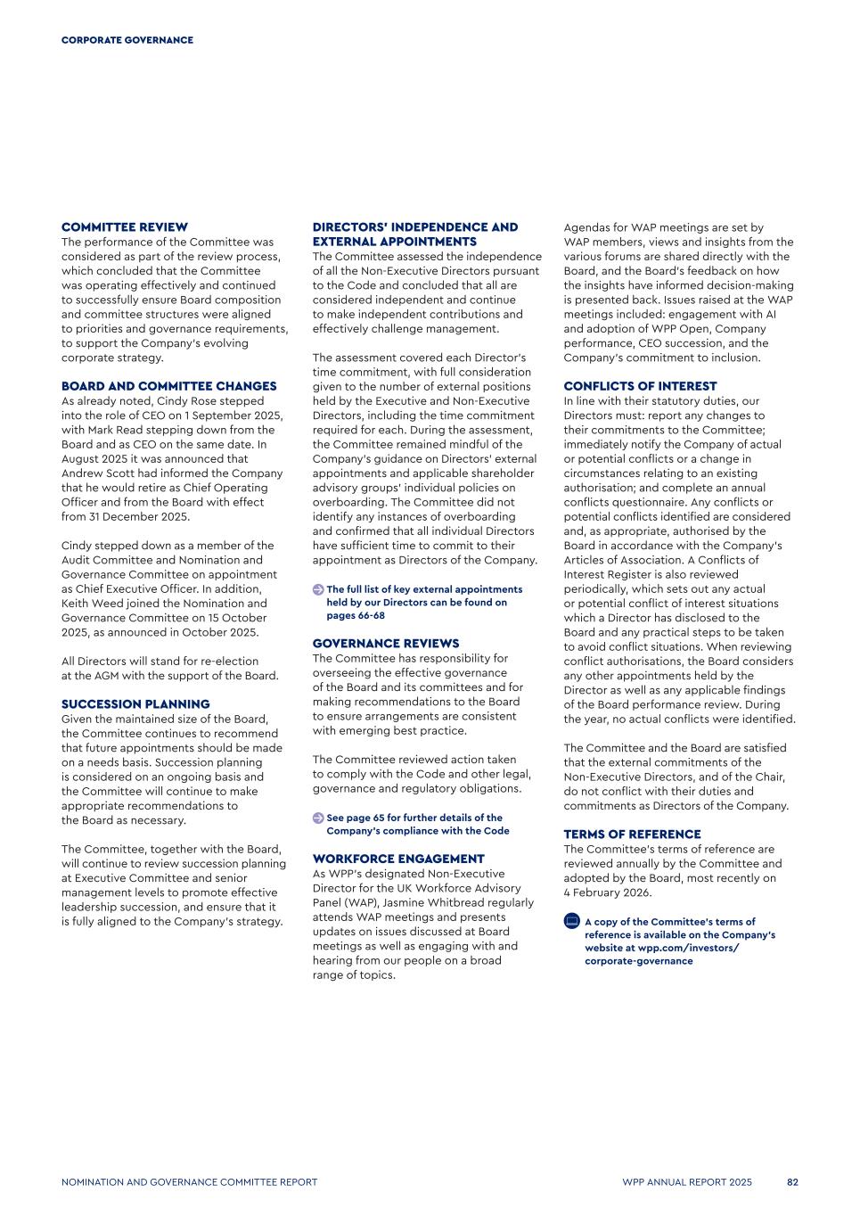 Agendas for WAP meetings are set by WAP members, views and insights from the various forums are shared directly with the Board, and the Board’s feedback on how the insights have informed decision-making is presented back. Issues raised at the WAP meetings included: engagement with AI and adoption of WPP Open, Company performance, CEO succession, and the Company’s commitment to inclusion. CONFLICTS OF INTEREST In line with their statutory duties, our Directors must: report any changes to their commitments to the Committee; immediately notify the Company of actual or potential conflicts or a change in circumstances relating to an existing authorisation; and complete an annual conflicts questionnaire. Any conflicts or potential conflicts identified are considered and, as appropriate, authorised by the Board in accordance with the Company’s Articles of Association. A Conflicts of Interest Register is also reviewed periodically, which sets out any actual or potential conflict of interest situations which a Director has disclosed to the Board and any practical steps to be taken to avoid conflict situations. When reviewing conflict authorisations, the Board considers any other appointments held by the Director as well as any applicable findings of the Board performance review. During the year, no actual conflicts were identified. The Committee and the Board are satisfied that the external commitments of the Non-Executive Directors, and of the Chair, do not conflict with their duties and commitments as Directors of the Company. TERMS OF REFERENCE The Committee’s terms of reference are reviewed annually by the Committee and adopted by the Board, most recently on 4 February 2026.   A copy of the Committee’s terms of reference is available on the Company’s website at wpp.com/investors/ corporate-governance COMMITTEE REVIEW The performance of the Committee was considered as part of the review process, which concluded that the Committee was operating effectively and continued to successfully ensure Board composition and committee structures were aligned to priorities and governance requirements, to support the Company’s evolving corporate strategy. BOARD AND COMMITTEE CHANGES As already noted, Cindy Rose stepped into the role of CEO on 1 September 2025, with Mark Read stepping down from the Board and as CEO on the same date. In August 2025 it was announced that Andrew Scott had informed the Company that he would retire as Chief Operating Officer and from the Board with effect from 31 December 2025. Cindy stepped down as a member of the Audit Committee and Nomination and Governance Committee on appointment as Chief Executive Officer. In addition, Keith Weed joined the Nomination and Governance Committee on 15 October 2025, as announced in October 2025. All Directors will stand for re-election at the AGM with the support of the Board. SUCCESSION PLANNING Given the maintained size of the Board, the Committee continues to recommend that future appointments should be made on a needs basis. Succession planning is considered on an ongoing basis and the Committee will continue to make appropriate recommendations to the Board as necessary. The Committee, together with the Board, will continue to review succession planning at Executive Committee and senior management levels to promote effective leadership succession, and ensure that it is fully aligned to the Company’s strategy. DIRECTORS’ INDEPENDENCE AND EXTERNAL APPOINTMENTS The Committee assessed the independence of all the Non-Executive Directors pursuant to the Code and concluded that all are considered independent and continue to make independent contributions and effectively challenge management. The assessment covered each Director’s time commitment, with full consideration given to the number of external positions held by the Executive and Non-Executive Directors, including the time commitment required for each. During the assessment, the Committee remained mindful of the Company’s guidance on Directors’ external appointments and applicable shareholder advisory groups’ individual policies on overboarding. The Committee did not identify any instances of overboarding and confirmed that all individual Directors have sufficient time to commit to their appointment as Directors of the Company. The full list of key external appointments held by our Directors can be found on pages 66-68 GOVERNANCE REVIEWS The Committee has responsibility for overseeing the effective governance of the Board and its committees and for making recommendations to the Board to ensure arrangements are consistent with emerging best practice. The Committee reviewed action taken to comply with the Code and other legal, governance and regulatory obligations. See page 65 for further details of the Company’s compliance with the Code WORKFORCE ENGAGEMENT As WPP’s designated Non-Executive Director for the UK Workforce Advisory Panel (WAP), Jasmine Whitbread regularly attends WAP meetings and presents updates on issues discussed at Board meetings as well as engaging with and hearing from our people on a broad range of topics. WPP ANNUAL REPORT 2025 82 CORPORATE GOVERNANCE NOMINATION AND GOVERNANCE COMMITTEE REPORT