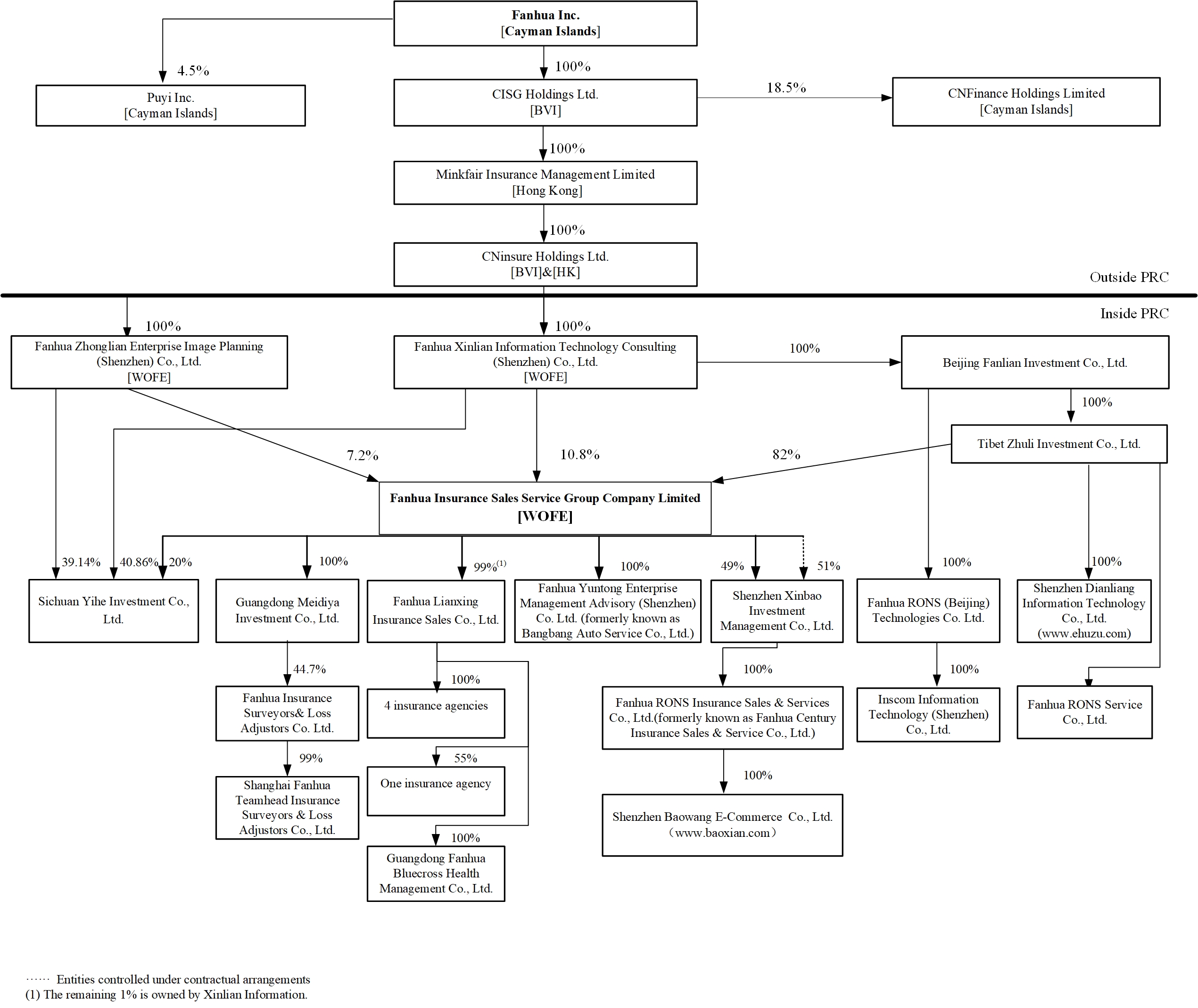 Fanhua Inc. is a Cayman Islands holding company primarily operating in China through (i) its PRC subsidiaries, including Zhonglian Enterprise and Xinlian Information, and their subsidiaries in which we hold equity ownership interests, and (ii) contractual arrangements among (x) our wholly-owned PRC subsidiary Fanhua Group Company, (y) the consolidated VIE, Xinbao Investment, a limited liability company established under PRC law, and (z) the individual nominee shareholder of the consolidated VIE. Fanhua Inc. holds 49% equity interests in the consolidated VIE. Investors in the ADSs thus are not purchasing, and may never directly hold all equity interests in the consolidated VIE.