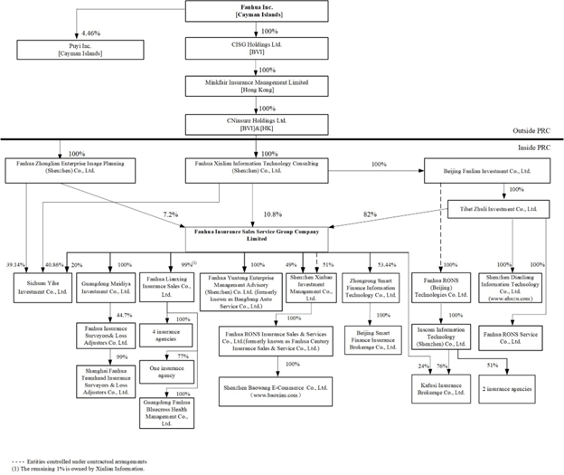 Fanhua Inc. is a Cayman Islands holding company primarily operating in China through (i) its PRC subsidiaries, including Fanhua Zhonglian Enterprise Image Planning (Shenzhen) Co., Ltd., or Zhonglian Enterprise, and Fanhua Xinlian Information Technology Consulting (Shenzhen) Co., Ltd., or Xinlian Information, and their subsidiaries in which we hold equity ownership interests, and (ii) contractual arrangements among (x) our wholly-owned PRC subsidiaries Fanhua Insurance Sales Service Group Company Limited, or Fanhua Group Company and Beijing Fanlian Investment Co., Ltd., or Fanlian Investment, (y) the consolidated VIEs, namely, Shenzhen Xinbao Investment Management Co., Ltd., or Xinbao Investment, and Fanhua RONS (Beijing) Technologies Co., Ltd., or Fanhua RONS Technologies, two limited liability companies established under PRC law, and (z) the individual nominee shareholder of the consolidated VIEs. Fanhua Inc. holds 49% equity interests in Xinbao Investment. Investors in the ADSs thus are not purchasing, and may never directly hold all equity interests in the consolidated VIEs. PRC laws, regulations, and rules restrict and impose conditions on direct foreign investment in certain types of business, and we therefore operate these businesses in China through the consolidated VIEs. For a summary of these contractual arrangements, see “Item 4. Information on the Company—C. Organizational Structure.” As used in this annual report, “we”, “us”, or “our” refers to Fanhua Inc. and its subsidiaries.