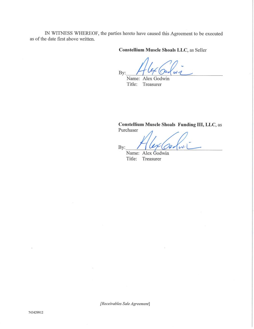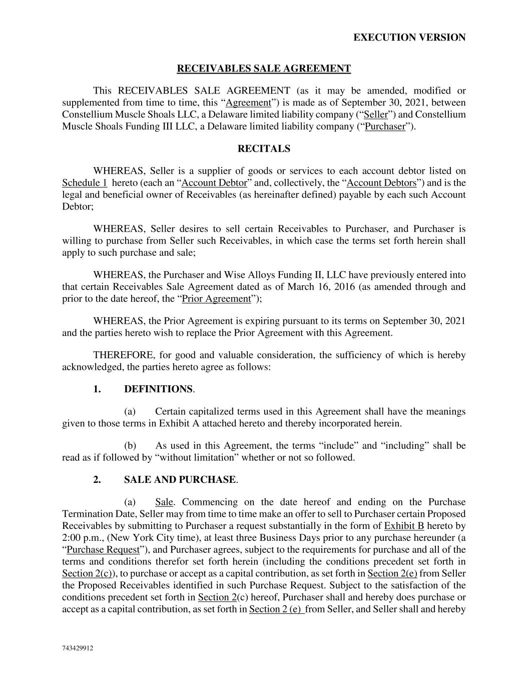 EXECUTION VERSION 743429912 RECEIVABLES SALE AGREEMENT This RECEIVABLES SALE AGREEMENT (as it may be amended, modified or supplemented from time to time, this “Agreement”) is made as of September 30, 2021, between Constellium Muscle Shoals LLC, a Delaware limited liability company (“Seller”) and Constellium Muscle Shoals Funding III LLC, a Delaware limited liability company (“Purchaser”). RECITALS WHEREAS, Seller is a supplier of goods or services to each account debtor listed on Schedule 1 hereto (each an “Account Debtor” and, collectively, the “Account Debtors”) and is the legal and beneficial owner of Receivables (as hereinafter defined) payable by each such Account Debtor; WHEREAS, Seller desires to sell certain Receivables to Purchaser, and Purchaser is willing to purchase from Seller such Receivables, in which case the terms set forth herein shall apply to such purchase and sale; WHEREAS, the Purchaser and Wise Alloys Funding II, LLC have previously entered into that certain Receivables Sale Agreement dated as of March 16, 2016 (as amended through and prior to the date hereof, the “Prior Agreement”); WHEREAS, the Prior Agreement is expiring pursuant to its terms on September 30, 2021 and the parties hereto wish to replace the Prior Agreement with this Agreement. THEREFORE, for good and valuable consideration, the sufficiency of which is hereby acknowledged, the parties hereto agree as follows: 1. DEFINITIONS. (a) Certain capitalized terms used in this Agreement shall have the meanings given to those terms in Exhibit A attached hereto and thereby incorporated herein. (b) As used in this Agreement, the terms “include” and “including” shall be read as if followed by “without limitation” whether or not so followed. 2. SALE AND PURCHASE. (a) Sale. Commencing on the date hereof and ending on the Purchase Termination Date, Seller may from time to time make an offer to sell to Purchaser certain Proposed Receivables by submitting to Purchaser a request substantially in the form of Exhibit B hereto by 2:00 p.m., (New York City time), at least three Business Days prior to any purchase hereunder (a “Purchase Request”), and Purchaser agrees, subject to the requirements for purchase and all of the terms and conditions therefor set forth herein (including the conditions precedent set forth in Section 2(c)), to purchase or accept as a capital contribution, as set forth in Section 2(e) from Seller the Proposed Receivables identified in such Purchase Request. Subject to the satisfaction of the conditions precedent set forth in Section 2(c) hereof, Purchaser shall and hereby does purchase or accept as a capital contribution, as set forth in Section 2 (e) from Seller, and Seller shall and hereby