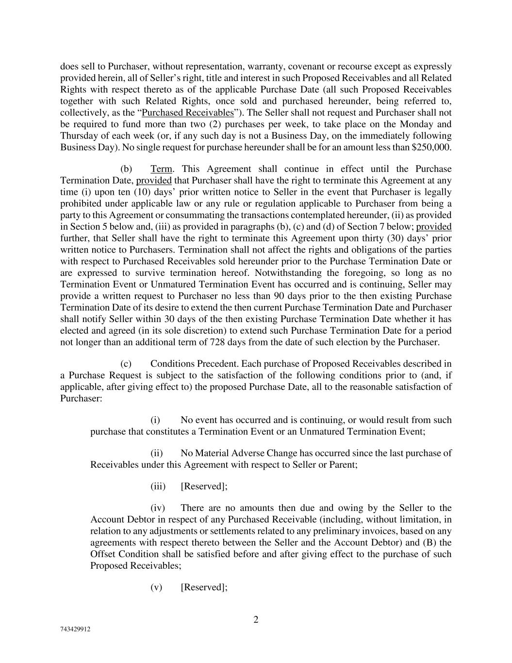 2 743429912 does sell to Purchaser, without representation, warranty, covenant or recourse except as expressly provided herein, all of Seller’s right, title and interest in such Proposed Receivables and all Related Rights with respect thereto as of the applicable Purchase Date (all such Proposed Receivables together with such Related Rights, once sold and purchased hereunder, being referred to, collectively, as the “Purchased Receivables”). The Seller shall not request and Purchaser shall not be required to fund more than two (2) purchases per week, to take place on the Monday and Thursday of each week (or, if any such day is not a Business Day, on the immediately following Business Day). No single request for purchase hereunder shall be for an amount less than $250,000. (b) Term. This Agreement shall continue in effect until the Purchase Termination Date, provided that Purchaser shall have the right to terminate this Agreement at any time (i) upon ten (10) days’ prior written notice to Seller in the event that Purchaser is legally prohibited under applicable law or any rule or regulation applicable to Purchaser from being a party to this Agreement or consummating the transactions contemplated hereunder, (ii) as provided in Section 5 below and, (iii) as provided in paragraphs (b), (c) and (d) of Section 7 below; provided further, that Seller shall have the right to terminate this Agreement upon thirty (30) days’ prior written notice to Purchasers. Termination shall not affect the rights and obligations of the parties with respect to Purchased Receivables sold hereunder prior to the Purchase Termination Date or are expressed to survive termination hereof. Notwithstanding the foregoing, so long as no Termination Event or Unmatured Termination Event has occurred and is continuing, Seller may provide a written request to Purchaser no less than 90 days prior to the then existing Purchase Termination Date of its desire to extend the then current Purchase Termination Date and Purchaser shall notify Seller within 30 days of the then existing Purchase Termination Date whether it has elected and agreed (in its sole discretion) to extend such Purchase Termination Date for a period not longer than an additional term of 728 days from the date of such election by the Purchaser. (c) Conditions Precedent. Each purchase of Proposed Receivables described in a Purchase Request is subject to the satisfaction of the following conditions prior to (and, if applicable, after giving effect to) the proposed Purchase Date, all to the reasonable satisfaction of Purchaser: (i) No event has occurred and is continuing, or would result from such purchase that constitutes a Termination Event or an Unmatured Termination Event; (ii) No Material Adverse Change has occurred since the last purchase of Receivables under this Agreement with respect to Seller or Parent; (iii) [Reserved]; (iv) There are no amounts then due and owing by the Seller to the Account Debtor in respect of any Purchased Receivable (including, without limitation, in relation to any adjustments or settlements related to any preliminary invoices, based on any agreements with respect thereto between the Seller and the Account Debtor) and (B) the Offset Condition shall be satisfied before and after giving effect to the purchase of such Proposed Receivables; (v) [Reserved];