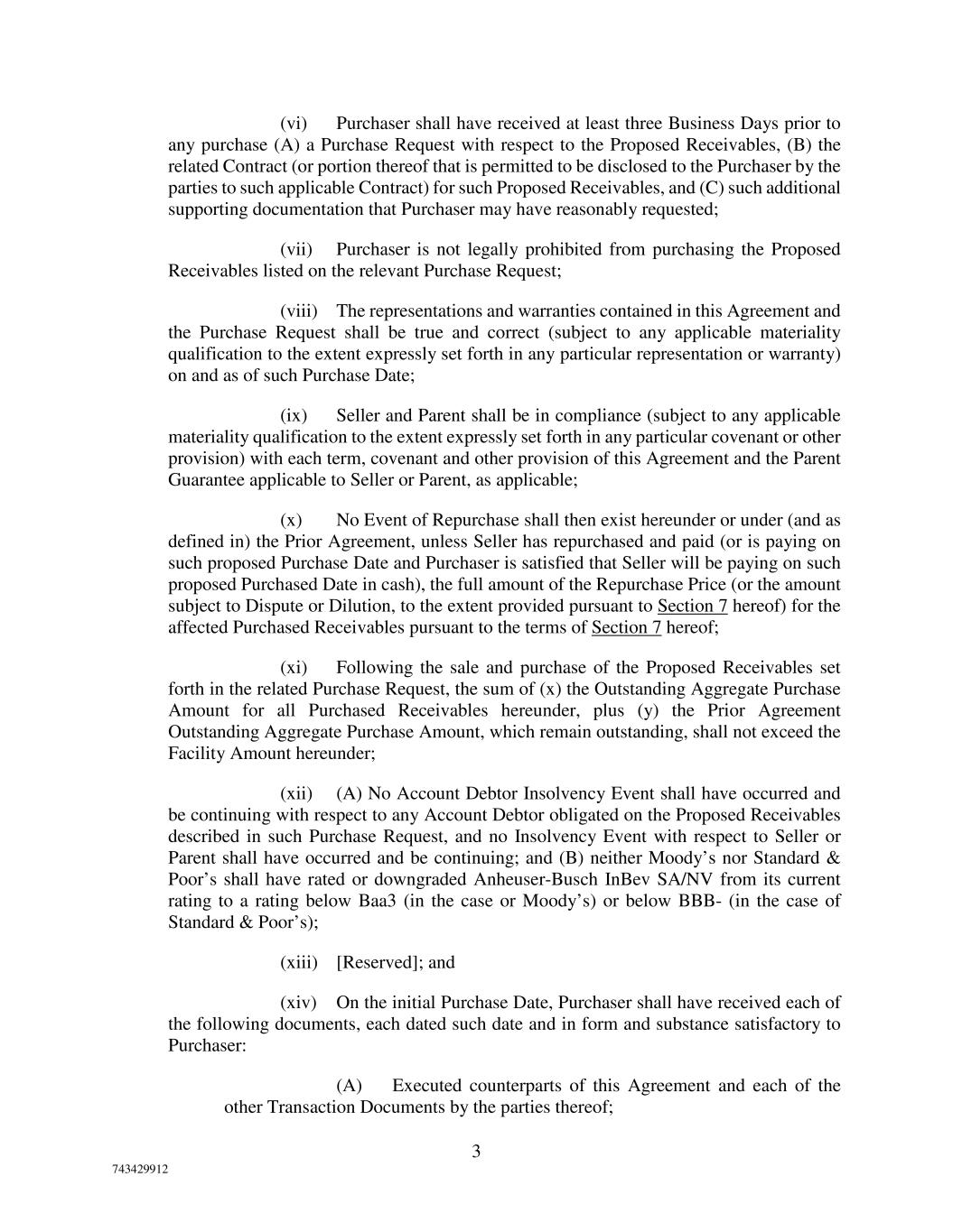 3 743429912 (vi) Purchaser shall have received at least three Business Days prior to any purchase (A) a Purchase Request with respect to the Proposed Receivables, (B) the related Contract (or portion thereof that is permitted to be disclosed to the Purchaser by the parties to such applicable Contract) for such Proposed Receivables, and (C) such additional supporting documentation that Purchaser may have reasonably requested; (vii) Purchaser is not legally prohibited from purchasing the Proposed Receivables listed on the relevant Purchase Request; (viii) The representations and warranties contained in this Agreement and the Purchase Request shall be true and correct (subject to any applicable materiality qualification to the extent expressly set forth in any particular representation or warranty) on and as of such Purchase Date; (ix) Seller and Parent shall be in compliance (subject to any applicable materiality qualification to the extent expressly set forth in any particular covenant or other provision) with each term, covenant and other provision of this Agreement and the Parent Guarantee applicable to Seller or Parent, as applicable; (x) No Event of Repurchase shall then exist hereunder or under (and as defined in) the Prior Agreement, unless Seller has repurchased and paid (or is paying on such proposed Purchase Date and Purchaser is satisfied that Seller will be paying on such proposed Purchased Date in cash), the full amount of the Repurchase Price (or the amount subject to Dispute or Dilution, to the extent provided pursuant to Section 7 hereof) for the affected Purchased Receivables pursuant to the terms of Section 7 hereof; (xi) Following the sale and purchase of the Proposed Receivables set forth in the related Purchase Request, the sum of (x) the Outstanding Aggregate Purchase Amount for all Purchased Receivables hereunder, plus (y) the Prior Agreement Outstanding Aggregate Purchase Amount, which remain outstanding, shall not exceed the Facility Amount hereunder; (xii) (A) No Account Debtor Insolvency Event shall have occurred and be continuing with respect to any Account Debtor obligated on the Proposed Receivables described in such Purchase Request, and no Insolvency Event with respect to Seller or Parent shall have occurred and be continuing; and (B) neither Moody’s nor Standard & Poor’s shall have rated or downgraded Anheuser-Busch InBev SA/NV from its current rating to a rating below Baa3 (in the case or Moody’s) or below BBB- (in the case of Standard & Poor’s); (xiii) [Reserved]; and (xiv) On the initial Purchase Date, Purchaser shall have received each of the following documents, each dated such date and in form and substance satisfactory to Purchaser: (A) Executed counterparts of this Agreement and each of the other Transaction Documents by the parties thereof;
