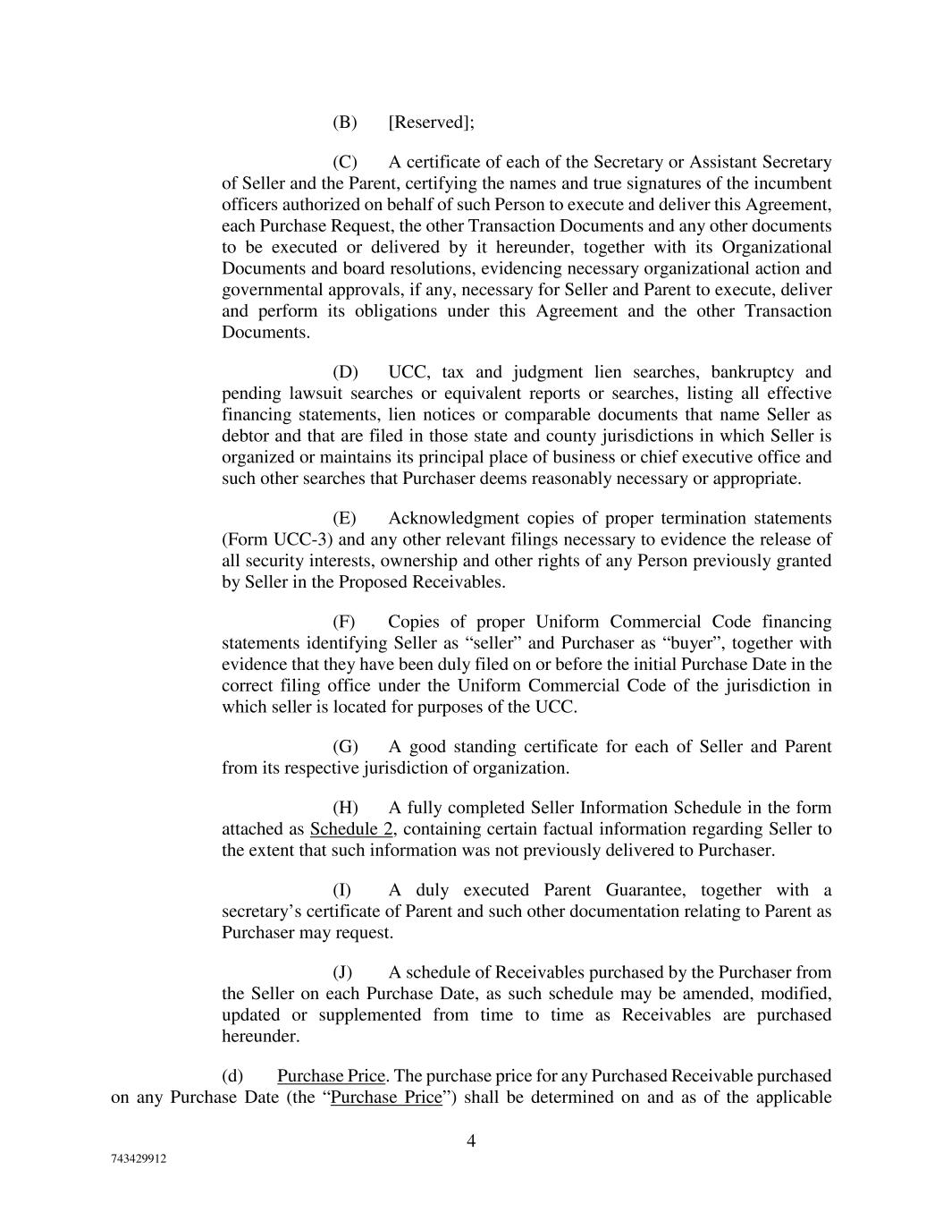 4 743429912 (B) [Reserved]; (C) A certificate of each of the Secretary or Assistant Secretary of Seller and the Parent, certifying the names and true signatures of the incumbent officers authorized on behalf of such Person to execute and deliver this Agreement, each Purchase Request, the other Transaction Documents and any other documents to be executed or delivered by it hereunder, together with its Organizational Documents and board resolutions, evidencing necessary organizational action and governmental approvals, if any, necessary for Seller and Parent to execute, deliver and perform its obligations under this Agreement and the other Transaction Documents. (D) UCC, tax and judgment lien searches, bankruptcy and pending lawsuit searches or equivalent reports or searches, listing all effective financing statements, lien notices or comparable documents that name Seller as debtor and that are filed in those state and county jurisdictions in which Seller is organized or maintains its principal place of business or chief executive office and such other searches that Purchaser deems reasonably necessary or appropriate. (E) Acknowledgment copies of proper termination statements (Form UCC-3) and any other relevant filings necessary to evidence the release of all security interests, ownership and other rights of any Person previously granted by Seller in the Proposed Receivables. (F) Copies of proper Uniform Commercial Code financing statements identifying Seller as “seller” and Purchaser as “buyer”, together with evidence that they have been duly filed on or before the initial Purchase Date in the correct filing office under the Uniform Commercial Code of the jurisdiction in which seller is located for purposes of the UCC. (G) A good standing certificate for each of Seller and Parent from its respective jurisdiction of organization. (H) A fully completed Seller Information Schedule in the form attached as Schedule 2, containing certain factual information regarding Seller to the extent that such information was not previously delivered to Purchaser. (I) A duly executed Parent Guarantee, together with a secretary’s certificate of Parent and such other documentation relating to Parent as Purchaser may request. (J) A schedule of Receivables purchased by the Purchaser from the Seller on each Purchase Date, as such schedule may be amended, modified, updated or supplemented from time to time as Receivables are purchased hereunder. (d) Purchase Price. The purchase price for any Purchased Receivable purchased on any Purchase Date (the “Purchase Price”) shall be determined on and as of the applicable