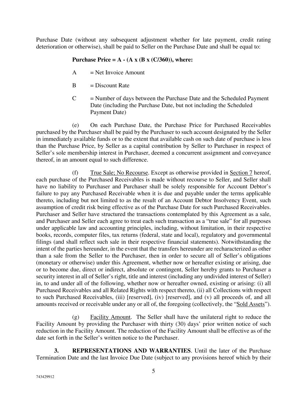5 743429912 Purchase Date (without any subsequent adjustment whether for late payment, credit rating deterioration or otherwise), shall be paid to Seller on the Purchase Date and shall be equal to: Purchase Price = A - (A x (B x (C/360)), where: A = Net Invoice Amount B = Discount Rate C = Number of days between the Purchase Date and the Scheduled Payment Date (including the Purchase Date, but not including the Scheduled Payment Date) (e) On each Purchase Date, the Purchase Price for Purchased Receivables purchased by the Purchaser shall be paid by the Purchaser to such account designated by the Seller in immediately available funds or to the extent that available cash on such date of purchase is less than the Purchase Price, by Seller as a capital contribution by Seller to Purchaser in respect of Seller’s sole membership interest in Purchaser, deemed a concurrent assignment and conveyance thereof, in an amount equal to such difference. (f) True Sale; No Recourse. Except as otherwise provided in Section 7 hereof, each purchase of the Purchased Receivables is made without recourse to Seller, and Seller shall have no liability to Purchaser and Purchaser shall be solely responsible for Account Debtor’s failure to pay any Purchased Receivable when it is due and payable under the terms applicable thereto, including but not limited to as the result of an Account Debtor Insolvency Event, such assumption of credit risk being effective as of the Purchase Date for such Purchased Receivables. Purchaser and Seller have structured the transactions contemplated by this Agreement as a sale, and Purchaser and Seller each agree to treat each such transaction as a “true sale” for all purposes under applicable law and accounting principles, including, without limitation, in their respective books, records, computer files, tax returns (federal, state and local), regulatory and governmental filings (and shall reflect such sale in their respective financial statements). Notwithstanding the intent of the parties hereunder, in the event that the transfers hereunder are recharacterized as other than a sale from the Seller to the Purchaser, then in order to secure all of Seller’s obligations (monetary or otherwise) under this Agreement, whether now or hereafter existing or arising, due or to become due, direct or indirect, absolute or contingent, Seller hereby grants to Purchaser a security interest in all of Seller’s right, title and interest (including any undivided interest of Seller) in, to and under all of the following, whether now or hereafter owned, existing or arising: (i) all Purchased Receivables and all Related Rights with respect thereto, (ii) all Collections with respect to such Purchased Receivables, (iii) [reserved], (iv) [reserved], and (v) all proceeds of, and all amounts received or receivable under any or all of, the foregoing (collectively, the “Sold Assets”). (g) Facility Amount. The Seller shall have the unilateral right to reduce the Facility Amount by providing the Purchaser with thirty (30) days’ prior written notice of such reduction in the Facility Amount. The reduction of the Facility Amount shall be effective as of the date set forth in the Seller’s written notice to the Purchaser. 3. REPRESENTATIONS AND WARRANTIES. Until the later of the Purchase Termination Date and the last Invoice Due Date (subject to any provisions hereof which by their