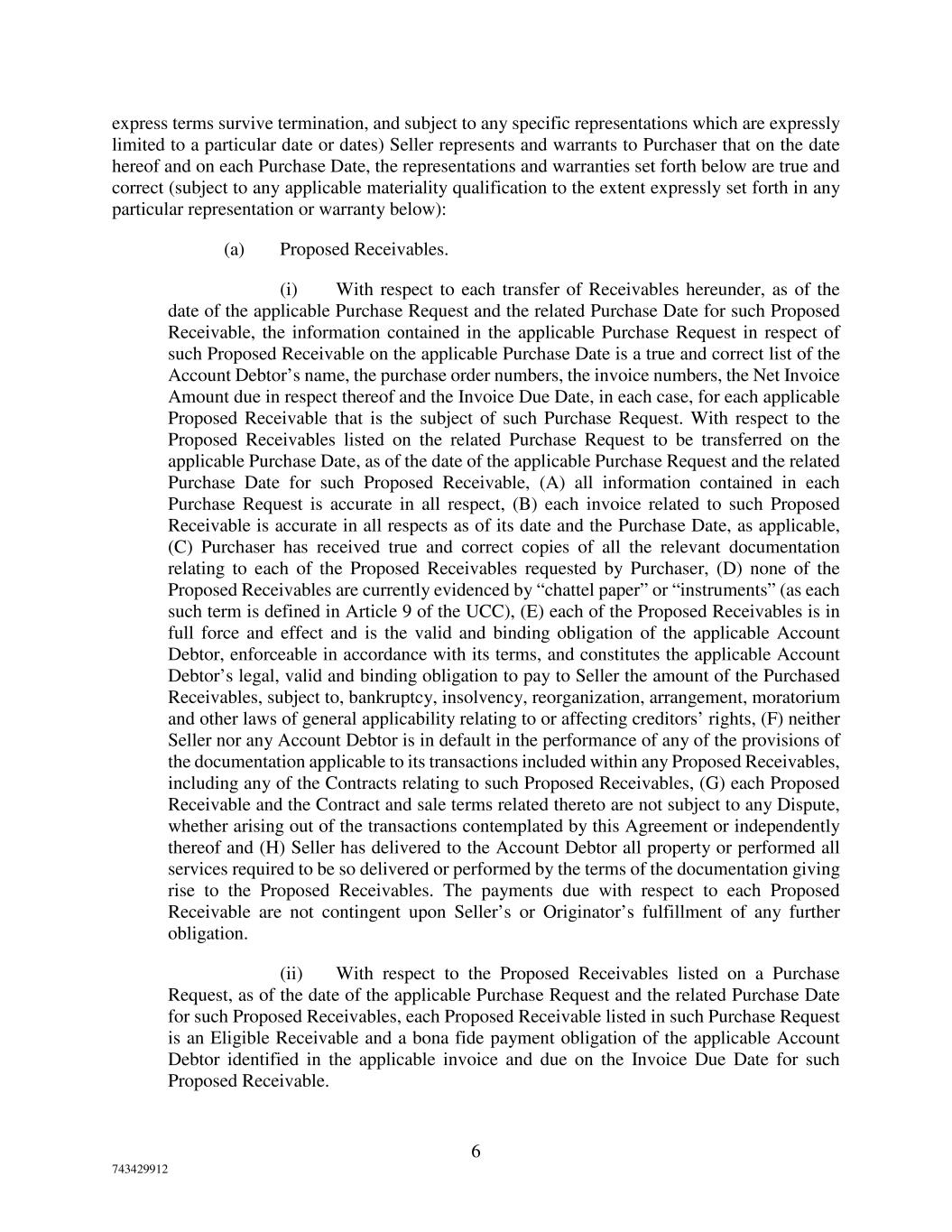 6 743429912 express terms survive termination, and subject to any specific representations which are expressly limited to a particular date or dates) Seller represents and warrants to Purchaser that on the date hereof and on each Purchase Date, the representations and warranties set forth below are true and correct (subject to any applicable materiality qualification to the extent expressly set forth in any particular representation or warranty below): (a) Proposed Receivables. (i) With respect to each transfer of Receivables hereunder, as of the date of the applicable Purchase Request and the related Purchase Date for such Proposed Receivable, the information contained in the applicable Purchase Request in respect of such Proposed Receivable on the applicable Purchase Date is a true and correct list of the Account Debtor’s name, the purchase order numbers, the invoice numbers, the Net Invoice Amount due in respect thereof and the Invoice Due Date, in each case, for each applicable Proposed Receivable that is the subject of such Purchase Request. With respect to the Proposed Receivables listed on the related Purchase Request to be transferred on the applicable Purchase Date, as of the date of the applicable Purchase Request and the related Purchase Date for such Proposed Receivable, (A) all information contained in each Purchase Request is accurate in all respect, (B) each invoice related to such Proposed Receivable is accurate in all respects as of its date and the Purchase Date, as applicable, (C) Purchaser has received true and correct copies of all the relevant documentation relating to each of the Proposed Receivables requested by Purchaser, (D) none of the Proposed Receivables are currently evidenced by “chattel paper” or “instruments” (as each such term is defined in Article 9 of the UCC), (E) each of the Proposed Receivables is in full force and effect and is the valid and binding obligation of the applicable Account Debtor, enforceable in accordance with its terms, and constitutes the applicable Account Debtor’s legal, valid and binding obligation to pay to Seller the amount of the Purchased Receivables, subject to, bankruptcy, insolvency, reorganization, arrangement, moratorium and other laws of general applicability relating to or affecting creditors’ rights, (F) neither Seller nor any Account Debtor is in default in the performance of any of the provisions of the documentation applicable to its transactions included within any Proposed Receivables, including any of the Contracts relating to such Proposed Receivables, (G) each Proposed Receivable and the Contract and sale terms related thereto are not subject to any Dispute, whether arising out of the transactions contemplated by this Agreement or independently thereof and (H) Seller has delivered to the Account Debtor all property or performed all services required to be so delivered or performed by the terms of the documentation giving rise to the Proposed Receivables. The payments due with respect to each Proposed Receivable are not contingent upon Seller’s or Originator’s fulfillment of any further obligation. (ii) With respect to the Proposed Receivables listed on a Purchase Request, as of the date of the applicable Purchase Request and the related Purchase Date for such Proposed Receivables, each Proposed Receivable listed in such Purchase Request is an Eligible Receivable and a bona fide payment obligation of the applicable Account Debtor identified in the applicable invoice and due on the Invoice Due Date for such Proposed Receivable.