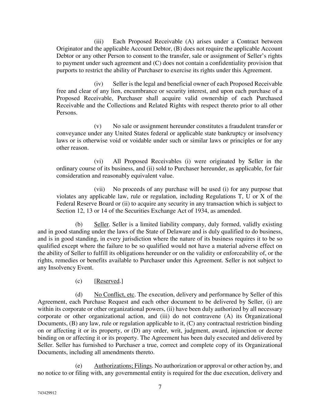 7 743429912 (iii) Each Proposed Receivable (A) arises under a Contract between Originator and the applicable Account Debtor, (B) does not require the applicable Account Debtor or any other Person to consent to the transfer, sale or assignment of Seller’s rights to payment under such agreement and (C) does not contain a confidentiality provision that purports to restrict the ability of Purchaser to exercise its rights under this Agreement. (iv) Seller is the legal and beneficial owner of each Proposed Receivable free and clear of any lien, encumbrance or security interest, and upon each purchase of a Proposed Receivable, Purchaser shall acquire valid ownership of each Purchased Receivable and the Collections and Related Rights with respect thereto prior to all other Persons. (v) No sale or assignment hereunder constitutes a fraudulent transfer or conveyance under any United States federal or applicable state bankruptcy or insolvency laws or is otherwise void or voidable under such or similar laws or principles or for any other reason. (vi) All Proposed Receivables (i) were originated by Seller in the ordinary course of its business, and (ii) sold to Purchaser hereunder, as applicable, for fair consideration and reasonably equivalent value. (vii) No proceeds of any purchase will be used (i) for any purpose that violates any applicable law, rule or regulation, including Regulations T, U or X of the Federal Reserve Board or (ii) to acquire any security in any transaction which is subject to Section 12, 13 or 14 of the Securities Exchange Act of 1934, as amended. (b) Seller. Seller is a limited liability company, duly formed, validly existing and in good standing under the laws of the State of Delaware and is duly qualified to do business, and is in good standing, in every jurisdiction where the nature of its business requires it to be so qualified except where the failure to be so qualified would not have a material adverse effect on the ability of Seller to fulfill its obligations hereunder or on the validity or enforceability of, or the rights, remedies or benefits available to Purchaser under this Agreement. Seller is not subject to any Insolvency Event. (c) [Reserved.] (d) No Conflict, etc. The execution, delivery and performance by Seller of this Agreement, each Purchase Request and each other document to be delivered by Seller, (i) are within its corporate or other organizational powers, (ii) have been duly authorized by all necessary corporate or other organizational action, and (iii) do not contravene (A) its Organizational Documents, (B) any law, rule or regulation applicable to it, (C) any contractual restriction binding on or affecting it or its property, or (D) any order, writ, judgment, award, injunction or decree binding on or affecting it or its property. The Agreement has been duly executed and delivered by Seller. Seller has furnished to Purchaser a true, correct and complete copy of its Organizational Documents, including all amendments thereto. (e) Authorizations; Filings. No authorization or approval or other action by, and no notice to or filing with, any governmental entity is required for the due execution, delivery and