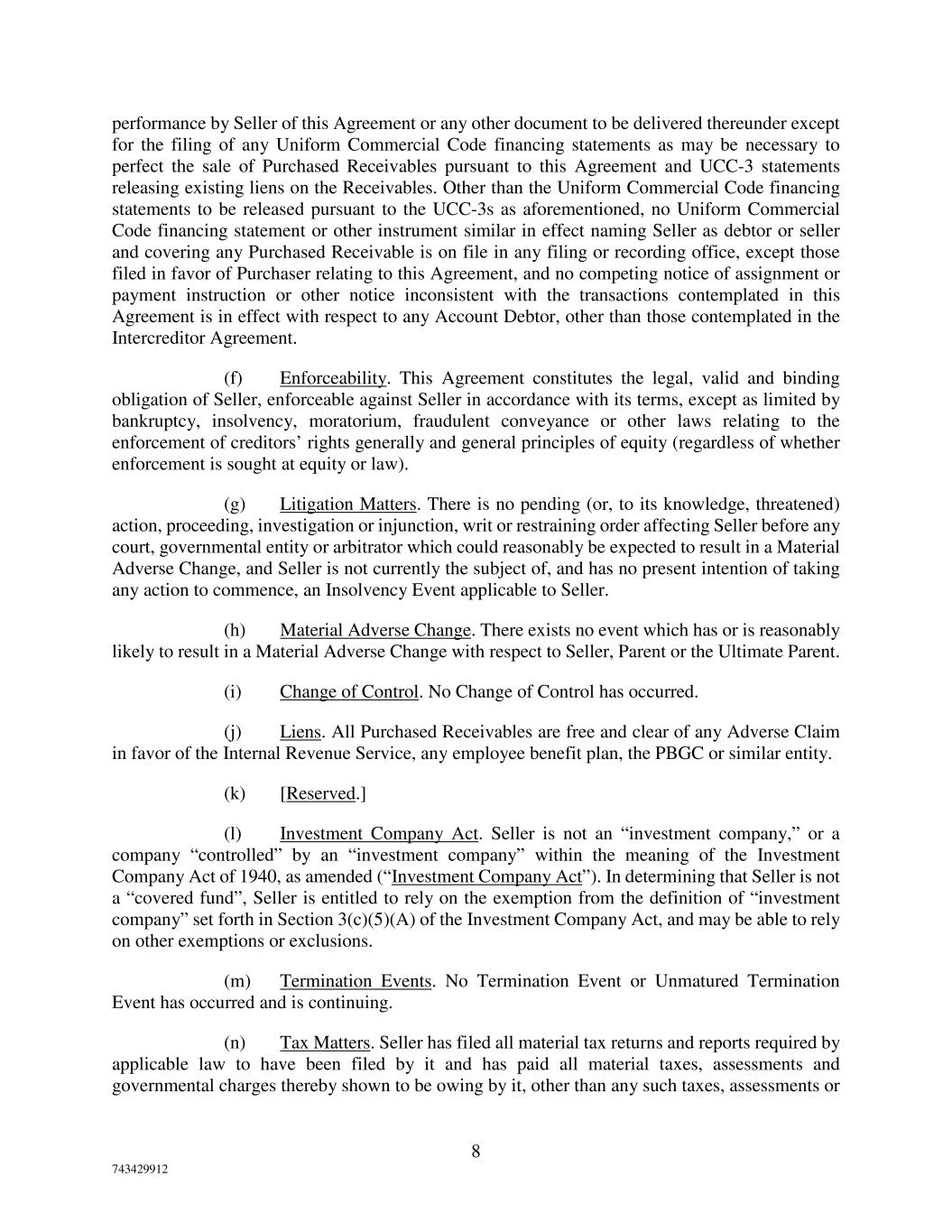 8 743429912 performance by Seller of this Agreement or any other document to be delivered thereunder except for the filing of any Uniform Commercial Code financing statements as may be necessary to perfect the sale of Purchased Receivables pursuant to this Agreement and UCC-3 statements releasing existing liens on the Receivables. Other than the Uniform Commercial Code financing statements to be released pursuant to the UCC-3s as aforementioned, no Uniform Commercial Code financing statement or other instrument similar in effect naming Seller as debtor or seller and covering any Purchased Receivable is on file in any filing or recording office, except those filed in favor of Purchaser relating to this Agreement, and no competing notice of assignment or payment instruction or other notice inconsistent with the transactions contemplated in this Agreement is in effect with respect to any Account Debtor, other than those contemplated in the Intercreditor Agreement. (f) Enforceability. This Agreement constitutes the legal, valid and binding obligation of Seller, enforceable against Seller in accordance with its terms, except as limited by bankruptcy, insolvency, moratorium, fraudulent conveyance or other laws relating to the enforcement of creditors’ rights generally and general principles of equity (regardless of whether enforcement is sought at equity or law). (g) Litigation Matters. There is no pending (or, to its knowledge, threatened) action, proceeding, investigation or injunction, writ or restraining order affecting Seller before any court, governmental entity or arbitrator which could reasonably be expected to result in a Material Adverse Change, and Seller is not currently the subject of, and has no present intention of taking any action to commence, an Insolvency Event applicable to Seller. (h) Material Adverse Change. There exists no event which has or is reasonably likely to result in a Material Adverse Change with respect to Seller, Parent or the Ultimate Parent. (i) Change of Control. No Change of Control has occurred. (j) Liens. All Purchased Receivables are free and clear of any Adverse Claim in favor of the Internal Revenue Service, any employee benefit plan, the PBGC or similar entity. (k) [Reserved.] (l) Investment Company Act. Seller is not an “investment company,” or a company “controlled” by an “investment company” within the meaning of the Investment Company Act of 1940, as amended (“Investment Company Act”). In determining that Seller is not a “covered fund”, Seller is entitled to rely on the exemption from the definition of “investment company” set forth in Section 3(c)(5)(A) of the Investment Company Act, and may be able to rely on other exemptions or exclusions. (m) Termination Events. No Termination Event or Unmatured Termination Event has occurred and is continuing. (n) Tax Matters. Seller has filed all material tax returns and reports required by applicable law to have been filed by it and has paid all material taxes, assessments and governmental charges thereby shown to be owing by it, other than any such taxes, assessments or