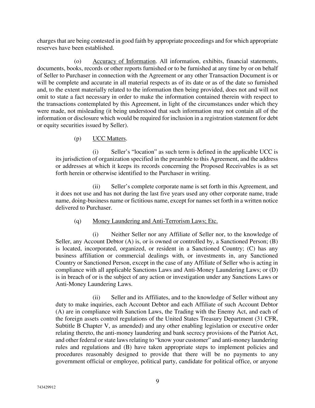 9 743429912 charges that are being contested in good faith by appropriate proceedings and for which appropriate reserves have been established. (o) Accuracy of Information. All information, exhibits, financial statements, documents, books, records or other reports furnished or to be furnished at any time by or on behalf of Seller to Purchaser in connection with the Agreement or any other Transaction Document is or will be complete and accurate in all material respects as of its date or as of the date so furnished and, to the extent materially related to the information then being provided, does not and will not omit to state a fact necessary in order to make the information contained therein with respect to the transactions contemplated by this Agreement, in light of the circumstances under which they were made, not misleading (it being understood that such information may not contain all of the information or disclosure which would be required for inclusion in a registration statement for debt or equity securities issued by Seller). (p) UCC Matters. (i) Seller’s “location” as such term is defined in the applicable UCC is its jurisdiction of organization specified in the preamble to this Agreement, and the address or addresses at which it keeps its records concerning the Proposed Receivables is as set forth herein or otherwise identified to the Purchaser in writing. (ii) Seller’s complete corporate name is set forth in this Agreement, and it does not use and has not during the last five years used any other corporate name, trade name, doing-business name or fictitious name, except for names set forth in a written notice delivered to Purchaser. (q) Money Laundering and Anti-Terrorism Laws; Etc. (i) Neither Seller nor any Affiliate of Seller nor, to the knowledge of Seller, any Account Debtor (A) is, or is owned or controlled by, a Sanctioned Person; (B) is located, incorporated, organized, or resident in a Sanctioned Country; (C) has any business affiliation or commercial dealings with, or investments in, any Sanctioned Country or Sanctioned Person, except in the case of any Affiliate of Seller who is acting in compliance with all applicable Sanctions Laws and Anti-Money Laundering Laws; or (D) is in breach of or is the subject of any action or investigation under any Sanctions Laws or Anti-Money Laundering Laws. (ii) Seller and its Affiliates, and to the knowledge of Seller without any duty to make inquiries, each Account Debtor and each Affiliate of such Account Debtor (A) are in compliance with Sanction Laws, the Trading with the Enemy Act, and each of the foreign assets control regulations of the United States Treasury Department (31 CFR, Subtitle B Chapter V, as amended) and any other enabling legislation or executive order relating thereto, the anti-money laundering and bank secrecy provisions of the Patriot Act, and other federal or state laws relating to “know your customer” and anti-money laundering rules and regulations and (B) have taken appropriate steps to implement policies and procedures reasonably designed to provide that there will be no payments to any government official or employee, political party, candidate for political office, or anyone