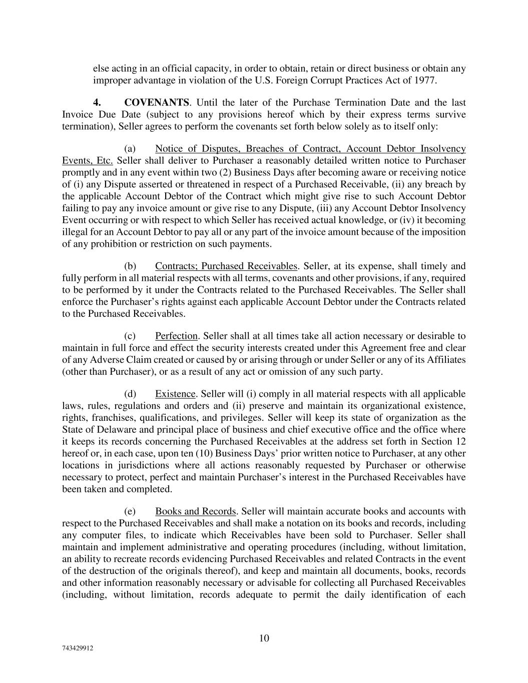 10 743429912 else acting in an official capacity, in order to obtain, retain or direct business or obtain any improper advantage in violation of the U.S. Foreign Corrupt Practices Act of 1977. 4. COVENANTS. Until the later of the Purchase Termination Date and the last Invoice Due Date (subject to any provisions hereof which by their express terms survive termination), Seller agrees to perform the covenants set forth below solely as to itself only: (a) Notice of Disputes, Breaches of Contract, Account Debtor Insolvency Events, Etc. Seller shall deliver to Purchaser a reasonably detailed written notice to Purchaser promptly and in any event within two (2) Business Days after becoming aware or receiving notice of (i) any Dispute asserted or threatened in respect of a Purchased Receivable, (ii) any breach by the applicable Account Debtor of the Contract which might give rise to such Account Debtor failing to pay any invoice amount or give rise to any Dispute, (iii) any Account Debtor Insolvency Event occurring or with respect to which Seller has received actual knowledge, or (iv) it becoming illegal for an Account Debtor to pay all or any part of the invoice amount because of the imposition of any prohibition or restriction on such payments. (b) Contracts; Purchased Receivables. Seller, at its expense, shall timely and fully perform in all material respects with all terms, covenants and other provisions, if any, required to be performed by it under the Contracts related to the Purchased Receivables. The Seller shall enforce the Purchaser’s rights against each applicable Account Debtor under the Contracts related to the Purchased Receivables. (c) Perfection. Seller shall at all times take all action necessary or desirable to maintain in full force and effect the security interests created under this Agreement free and clear of any Adverse Claim created or caused by or arising through or under Seller or any of its Affiliates (other than Purchaser), or as a result of any act or omission of any such party. (d) Existence. Seller will (i) comply in all material respects with all applicable laws, rules, regulations and orders and (ii) preserve and maintain its organizational existence, rights, franchises, qualifications, and privileges. Seller will keep its state of organization as the State of Delaware and principal place of business and chief executive office and the office where it keeps its records concerning the Purchased Receivables at the address set forth in Section 12 hereof or, in each case, upon ten (10) Business Days’ prior written notice to Purchaser, at any other locations in jurisdictions where all actions reasonably requested by Purchaser or otherwise necessary to protect, perfect and maintain Purchaser’s interest in the Purchased Receivables have been taken and completed. (e) Books and Records. Seller will maintain accurate books and accounts with respect to the Purchased Receivables and shall make a notation on its books and records, including any computer files, to indicate which Receivables have been sold to Purchaser. Seller shall maintain and implement administrative and operating procedures (including, without limitation, an ability to recreate records evidencing Purchased Receivables and related Contracts in the event of the destruction of the originals thereof), and keep and maintain all documents, books, records and other information reasonably necessary or advisable for collecting all Purchased Receivables (including, without limitation, records adequate to permit the daily identification of each