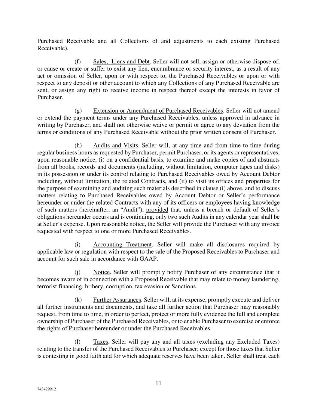11 743429912 Purchased Receivable and all Collections of and adjustments to each existing Purchased Receivable). (f) Sales, Liens and Debt. Seller will not sell, assign or otherwise dispose of, or cause or create or suffer to exist any lien, encumbrance or security interest, as a result of any act or omission of Seller, upon or with respect to, the Purchased Receivables or upon or with respect to any deposit or other account to which any Collections of any Purchased Receivable are sent, or assign any right to receive income in respect thereof except the interests in favor of Purchaser. (g) Extension or Amendment of Purchased Receivables. Seller will not amend or extend the payment terms under any Purchased Receivables, unless approved in advance in writing by Purchaser, and shall not otherwise waive or permit or agree to any deviation from the terms or conditions of any Purchased Receivable without the prior written consent of Purchaser. (h) Audits and Visits. Seller will, at any time and from time to time during regular business hours as requested by Purchaser, permit Purchaser, or its agents or representatives, upon reasonable notice, (i) on a confidential basis, to examine and make copies of and abstracts from all books, records and documents (including, without limitation, computer tapes and disks) in its possession or under its control relating to Purchased Receivables owed by Account Debtor including, without limitation, the related Contracts, and (ii) to visit its offices and properties for the purpose of examining and auditing such materials described in clause (i) above, and to discuss matters relating to Purchased Receivables owed by Account Debtor or Seller’s performance hereunder or under the related Contracts with any of its officers or employees having knowledge of such matters (hereinafter, an “Audit”), provided that, unless a breach or default of Seller’s obligations hereunder occurs and is continuing, only two such Audits in any calendar year shall be at Seller’s expense. Upon reasonable notice, the Seller will provide the Purchaser with any invoice requested with respect to one or more Purchased Receivables. (i) Accounting Treatment. Seller will make all disclosures required by applicable law or regulation with respect to the sale of the Proposed Receivables to Purchaser and account for such sale in accordance with GAAP. (j) Notice. Seller will promptly notify Purchaser of any circumstance that it becomes aware of in connection with a Proposed Receivable that may relate to money laundering, terrorist financing, bribery, corruption, tax evasion or Sanctions. (k) Further Assurances. Seller will, at its expense, promptly execute and deliver all further instruments and documents, and take all further action that Purchaser may reasonably request, from time to time, in order to perfect, protect or more fully evidence the full and complete ownership of Purchaser of the Purchased Receivables, or to enable Purchaser to exercise or enforce the rights of Purchaser hereunder or under the Purchased Receivables. (l) Taxes. Seller will pay any and all taxes (excluding any Excluded Taxes) relating to the transfer of the Purchased Receivables to Purchaser; except for those taxes that Seller is contesting in good faith and for which adequate reserves have been taken. Seller shall treat each