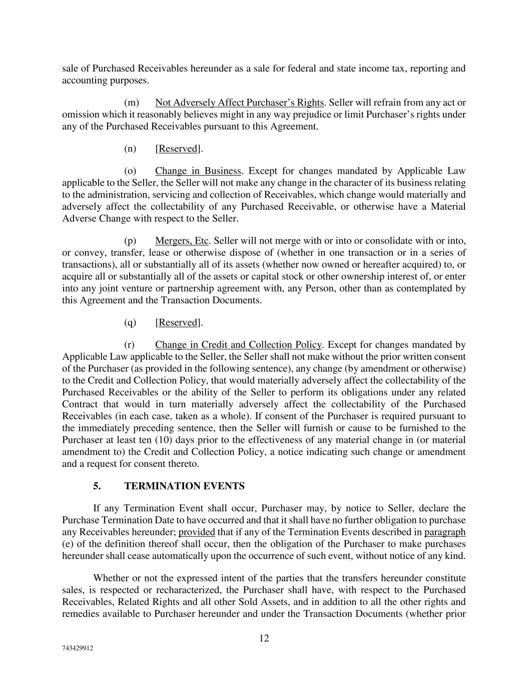 12 743429912 sale of Purchased Receivables hereunder as a sale for federal and state income tax, reporting and accounting purposes. (m) Not Adversely Affect Purchaser’s Rights. Seller will refrain from any act or omission which it reasonably believes might in any way prejudice or limit Purchaser’s rights under any of the Purchased Receivables pursuant to this Agreement. (n) [Reserved]. (o) Change in Business. Except for changes mandated by Applicable Law applicable to the Seller, the Seller will not make any change in the character of its business relating to the administration, servicing and collection of Receivables, which change would materially and adversely affect the collectability of any Purchased Receivable, or otherwise have a Material Adverse Change with respect to the Seller. (p) Mergers, Etc. Seller will not merge with or into or consolidate with or into, or convey, transfer, lease or otherwise dispose of (whether in one transaction or in a series of transactions), all or substantially all of its assets (whether now owned or hereafter acquired) to, or acquire all or substantially all of the assets or capital stock or other ownership interest of, or enter into any joint venture or partnership agreement with, any Person, other than as contemplated by this Agreement and the Transaction Documents. (q) [Reserved]. (r) Change in Credit and Collection Policy. Except for changes mandated by Applicable Law applicable to the Seller, the Seller shall not make without the prior written consent of the Purchaser (as provided in the following sentence), any change (by amendment or otherwise) to the Credit and Collection Policy, that would materially adversely affect the collectability of the Purchased Receivables or the ability of the Seller to perform its obligations under any related Contract that would in turn materially adversely affect the collectability of the Purchased Receivables (in each case, taken as a whole). If consent of the Purchaser is required pursuant to the immediately preceding sentence, then the Seller will furnish or cause to be furnished to the Purchaser at least ten (10) days prior to the effectiveness of any material change in (or material amendment to) the Credit and Collection Policy, a notice indicating such change or amendment and a request for consent thereto. 5. TERMINATION EVENTS If any Termination Event shall occur, Purchaser may, by notice to Seller, declare the Purchase Termination Date to have occurred and that it shall have no further obligation to purchase any Receivables hereunder; provided that if any of the Termination Events described in paragraph (e) of the definition thereof shall occur, then the obligation of the Purchaser to make purchases hereunder shall cease automatically upon the occurrence of such event, without notice of any kind. Whether or not the expressed intent of the parties that the transfers hereunder constitute sales, is respected or recharacterized, the Purchaser shall have, with respect to the Purchased Receivables, Related Rights and all other Sold Assets, and in addition to all the other rights and remedies available to Purchaser hereunder and under the Transaction Documents (whether prior