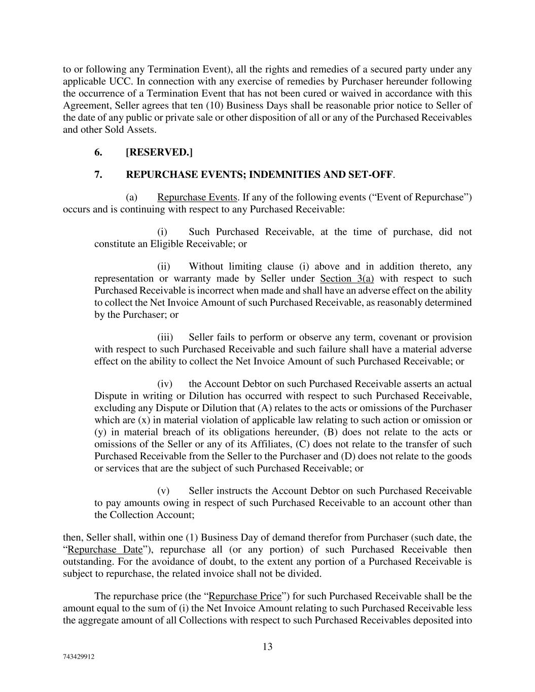 13 743429912 to or following any Termination Event), all the rights and remedies of a secured party under any applicable UCC. In connection with any exercise of remedies by Purchaser hereunder following the occurrence of a Termination Event that has not been cured or waived in accordance with this Agreement, Seller agrees that ten (10) Business Days shall be reasonable prior notice to Seller of the date of any public or private sale or other disposition of all or any of the Purchased Receivables and other Sold Assets. 6. [RESERVED.] 7. REPURCHASE EVENTS; INDEMNITIES AND SET-OFF. (a) Repurchase Events. If any of the following events (“Event of Repurchase”) occurs and is continuing with respect to any Purchased Receivable: (i) Such Purchased Receivable, at the time of purchase, did not constitute an Eligible Receivable; or (ii) Without limiting clause (i) above and in addition thereto, any representation or warranty made by Seller under Section 3(a) with respect to such Purchased Receivable is incorrect when made and shall have an adverse effect on the ability to collect the Net Invoice Amount of such Purchased Receivable, as reasonably determined by the Purchaser; or (iii) Seller fails to perform or observe any term, covenant or provision with respect to such Purchased Receivable and such failure shall have a material adverse effect on the ability to collect the Net Invoice Amount of such Purchased Receivable; or (iv) the Account Debtor on such Purchased Receivable asserts an actual Dispute in writing or Dilution has occurred with respect to such Purchased Receivable, excluding any Dispute or Dilution that (A) relates to the acts or omissions of the Purchaser which are (x) in material violation of applicable law relating to such action or omission or (y) in material breach of its obligations hereunder, (B) does not relate to the acts or omissions of the Seller or any of its Affiliates, (C) does not relate to the transfer of such Purchased Receivable from the Seller to the Purchaser and (D) does not relate to the goods or services that are the subject of such Purchased Receivable; or (v) Seller instructs the Account Debtor on such Purchased Receivable to pay amounts owing in respect of such Purchased Receivable to an account other than the Collection Account; then, Seller shall, within one (1) Business Day of demand therefor from Purchaser (such date, the “Repurchase Date”), repurchase all (or any portion) of such Purchased Receivable then outstanding. For the avoidance of doubt, to the extent any portion of a Purchased Receivable is subject to repurchase, the related invoice shall not be divided. The repurchase price (the “Repurchase Price”) for such Purchased Receivable shall be the amount equal to the sum of (i) the Net Invoice Amount relating to such Purchased Receivable less the aggregate amount of all Collections with respect to such Purchased Receivables deposited into