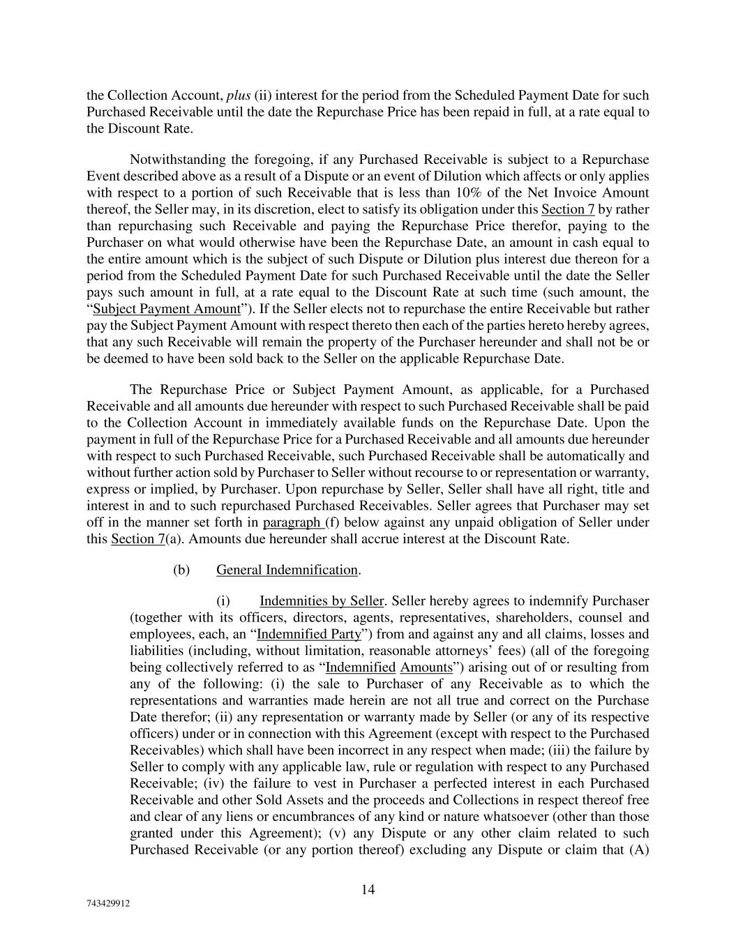 14 743429912 the Collection Account, plus (ii) interest for the period from the Scheduled Payment Date for such Purchased Receivable until the date the Repurchase Price has been repaid in full, at a rate equal to the Discount Rate. Notwithstanding the foregoing, if any Purchased Receivable is subject to a Repurchase Event described above as a result of a Dispute or an event of Dilution which affects or only applies with respect to a portion of such Receivable that is less than 10% of the Net Invoice Amount thereof, the Seller may, in its discretion, elect to satisfy its obligation under this Section 7 by rather than repurchasing such Receivable and paying the Repurchase Price therefor, paying to the Purchaser on what would otherwise have been the Repurchase Date, an amount in cash equal to the entire amount which is the subject of such Dispute or Dilution plus interest due thereon for a period from the Scheduled Payment Date for such Purchased Receivable until the date the Seller pays such amount in full, at a rate equal to the Discount Rate at such time (such amount, the “Subject Payment Amount”). If the Seller elects not to repurchase the entire Receivable but rather pay the Subject Payment Amount with respect thereto then each of the parties hereto hereby agrees, that any such Receivable will remain the property of the Purchaser hereunder and shall not be or be deemed to have been sold back to the Seller on the applicable Repurchase Date. The Repurchase Price or Subject Payment Amount, as applicable, for a Purchased Receivable and all amounts due hereunder with respect to such Purchased Receivable shall be paid to the Collection Account in immediately available funds on the Repurchase Date. Upon the payment in full of the Repurchase Price for a Purchased Receivable and all amounts due hereunder with respect to such Purchased Receivable, such Purchased Receivable shall be automatically and without further action sold by Purchaser to Seller without recourse to or representation or warranty, express or implied, by Purchaser. Upon repurchase by Seller, Seller shall have all right, title and interest in and to such repurchased Purchased Receivables. Seller agrees that Purchaser may set off in the manner set forth in paragraph (f) below against any unpaid obligation of Seller under this Section 7(a). Amounts due hereunder shall accrue interest at the Discount Rate. (b) General Indemnification. (i) Indemnities by Seller. Seller hereby agrees to indemnify Purchaser (together with its officers, directors, agents, representatives, shareholders, counsel and employees, each, an “Indemnified Party”) from and against any and all claims, losses and liabilities (including, without limitation, reasonable attorneys’ fees) (all of the foregoing being collectively referred to as “Indemnified Amounts”) arising out of or resulting from any of the following: (i) the sale to Purchaser of any Receivable as to which the representations and warranties made herein are not all true and correct on the Purchase Date therefor; (ii) any representation or warranty made by Seller (or any of its respective officers) under or in connection with this Agreement (except with respect to the Purchased Receivables) which shall have been incorrect in any respect when made; (iii) the failure by Seller to comply with any applicable law, rule or regulation with respect to any Purchased Receivable; (iv) the failure to vest in Purchaser a perfected interest in each Purchased Receivable and other Sold Assets and the proceeds and Collections in respect thereof free and clear of any liens or encumbrances of any kind or nature whatsoever (other than those granted under this Agreement); (v) any Dispute or any other claim related to such Purchased Receivable (or any portion thereof) excluding any Dispute or claim that (A)