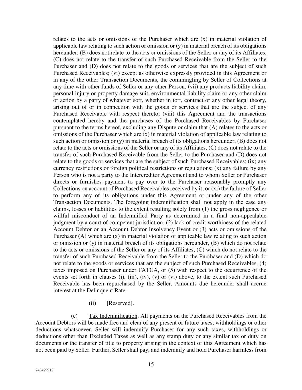 15 743429912 relates to the acts or omissions of the Purchaser which are (x) in material violation of applicable law relating to such action or omission or (y) in material breach of its obligations hereunder, (B) does not relate to the acts or omissions of the Seller or any of its Affiliates, (C) does not relate to the transfer of such Purchased Receivable from the Seller to the Purchaser and (D) does not relate to the goods or services that are the subject of such Purchased Receivables; (vi) except as otherwise expressly provided in this Agreement or in any of the other Transaction Documents, the commingling by Seller of Collections at any time with other funds of Seller or any other Person; (vii) any products liability claim, personal injury or property damage suit, environmental liability claim or any other claim or action by a party of whatever sort, whether in tort, contract or any other legal theory, arising out of or in connection with the goods or services that are the subject of any Purchased Receivable with respect thereto; (viii) this Agreement and the transactions contemplated hereby and the purchases of the Purchased Receivables by Purchaser pursuant to the terms hereof, excluding any Dispute or claim that (A) relates to the acts or omissions of the Purchaser which are (x) in material violation of applicable law relating to such action or omission or (y) in material breach of its obligations hereunder, (B) does not relate to the acts or omissions of the Seller or any of its Affiliates, (C) does not relate to the transfer of such Purchased Receivable from the Seller to the Purchaser and (D) does not relate to the goods or services that are the subject of such Purchased Receivables; (ix) any currency restrictions or foreign political restrictions or regulations; (x) any failure by any Person who is not a party to the Intercreditor Agreement and to whom Seller or Purchaser directs or furnishes payment to pay over to the Purchaser reasonably promptly any Collections on account of Purchased Receivables received by it; or (xi) the failure of Seller to perform any of its obligations under this Agreement or under any of the other Transaction Documents. The foregoing indemnification shall not apply in the case any claims, losses or liabilities to the extent resulting solely from (1) the gross negligence or willful misconduct of an Indemnified Party as determined in a final non-appealable judgment by a court of competent jurisdiction, (2) lack of credit worthiness of the related Account Debtor or an Account Debtor Insolvency Event or (3) acts or omissions of the Purchaser (A) which are (x) in material violation of applicable law relating to such action or omission or (y) in material breach of its obligations hereunder, (B) which do not relate to the acts or omissions of the Seller or any of its Affiliates, (C) which do not relate to the transfer of such Purchased Receivable from the Seller to the Purchaser and (D) which do not relate to the goods or services that are the subject of such Purchased Receivables, (4) taxes imposed on Purchaser under FATCA, or (5) with respect to the occurrence of the events set forth in clauses (i), (iii), (iv), (v) or (vi) above, to the extent such Purchased Receivable has been repurchased by the Seller. Amounts due hereunder shall accrue interest at the Delinquent Rate. (ii) [Reserved]. (c) Tax Indemnification. All payments on the Purchased Receivables from the Account Debtors will be made free and clear of any present or future taxes, withholdings or other deductions whatsoever. Seller will indemnify Purchaser for any such taxes, withholdings or deductions other than Excluded Taxes as well as any stamp duty or any similar tax or duty on documents or the transfer of title to property arising in the context of this Agreement which has not been paid by Seller. Further, Seller shall pay, and indemnify and hold Purchaser harmless from