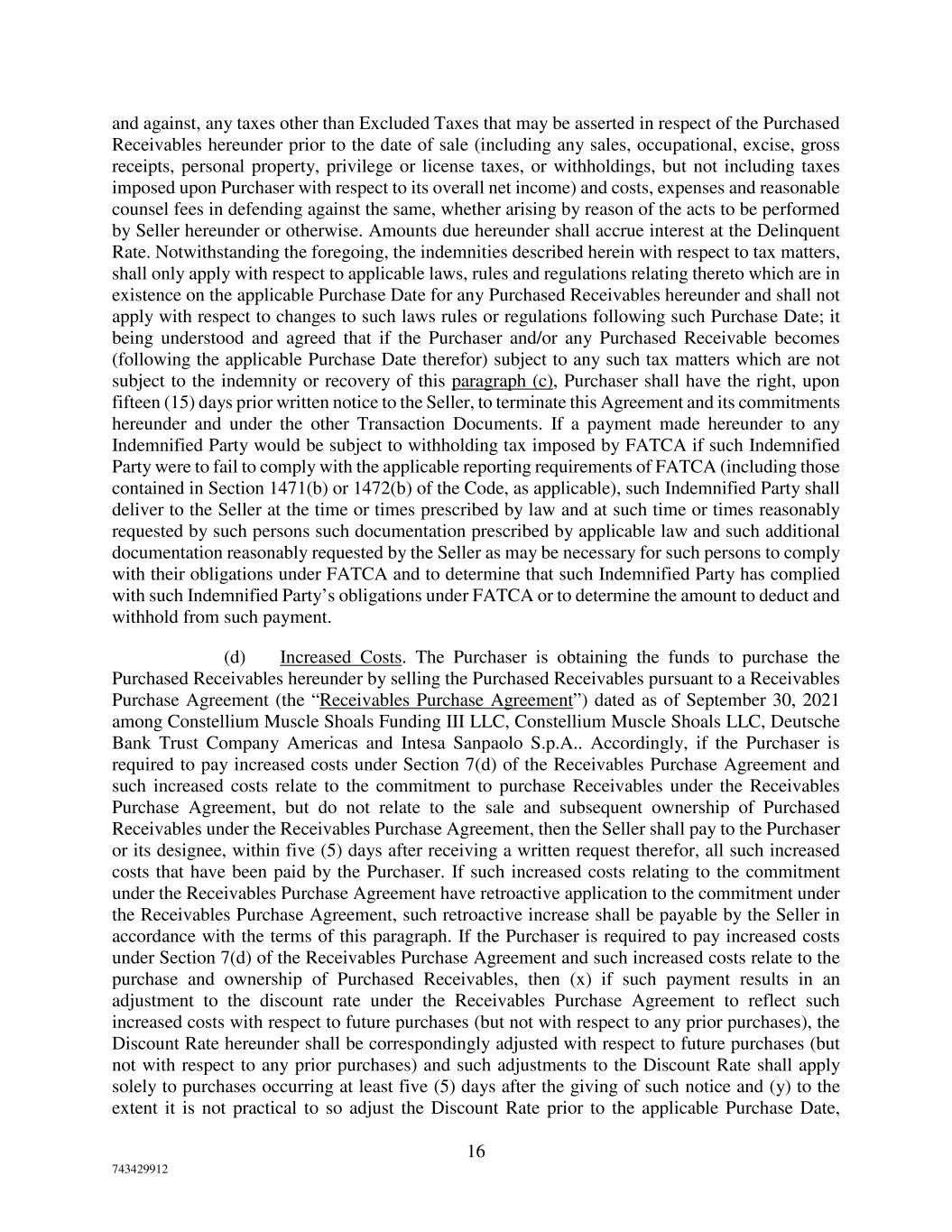 16 743429912 and against, any taxes other than Excluded Taxes that may be asserted in respect of the Purchased Receivables hereunder prior to the date of sale (including any sales, occupational, excise, gross receipts, personal property, privilege or license taxes, or withholdings, but not including taxes imposed upon Purchaser with respect to its overall net income) and costs, expenses and reasonable counsel fees in defending against the same, whether arising by reason of the acts to be performed by Seller hereunder or otherwise. Amounts due hereunder shall accrue interest at the Delinquent Rate. Notwithstanding the foregoing, the indemnities described herein with respect to tax matters, shall only apply with respect to applicable laws, rules and regulations relating thereto which are in existence on the applicable Purchase Date for any Purchased Receivables hereunder and shall not apply with respect to changes to such laws rules or regulations following such Purchase Date; it being understood and agreed that if the Purchaser and/or any Purchased Receivable becomes (following the applicable Purchase Date therefor) subject to any such tax matters which are not subject to the indemnity or recovery of this paragraph (c), Purchaser shall have the right, upon fifteen (15) days prior written notice to the Seller, to terminate this Agreement and its commitments hereunder and under the other Transaction Documents. If a payment made hereunder to any Indemnified Party would be subject to withholding tax imposed by FATCA if such Indemnified Party were to fail to comply with the applicable reporting requirements of FATCA (including those contained in Section 1471(b) or 1472(b) of the Code, as applicable), such Indemnified Party shall deliver to the Seller at the time or times prescribed by law and at such time or times reasonably requested by such persons such documentation prescribed by applicable law and such additional documentation reasonably requested by the Seller as may be necessary for such persons to comply with their obligations under FATCA and to determine that such Indemnified Party has complied with such Indemnified Party’s obligations under FATCA or to determine the amount to deduct and withhold from such payment. (d) Increased Costs. The Purchaser is obtaining the funds to purchase the Purchased Receivables hereunder by selling the Purchased Receivables pursuant to a Receivables Purchase Agreement (the “Receivables Purchase Agreement”) dated as of September 30, 2021 among Constellium Muscle Shoals Funding III LLC, Constellium Muscle Shoals LLC, Deutsche Bank Trust Company Americas and Intesa Sanpaolo S.p.A.. Accordingly, if the Purchaser is required to pay increased costs under Section 7(d) of the Receivables Purchase Agreement and such increased costs relate to the commitment to purchase Receivables under the Receivables Purchase Agreement, but do not relate to the sale and subsequent ownership of Purchased Receivables under the Receivables Purchase Agreement, then the Seller shall pay to the Purchaser or its designee, within five (5) days after receiving a written request therefor, all such increased costs that have been paid by the Purchaser. If such increased costs relating to the commitment under the Receivables Purchase Agreement have retroactive application to the commitment under the Receivables Purchase Agreement, such retroactive increase shall be payable by the Seller in accordance with the terms of this paragraph. If the Purchaser is required to pay increased costs under Section 7(d) of the Receivables Purchase Agreement and such increased costs relate to the purchase and ownership of Purchased Receivables, then (x) if such payment results in an adjustment to the discount rate under the Receivables Purchase Agreement to reflect such increased costs with respect to future purchases (but not with respect to any prior purchases), the Discount Rate hereunder shall be correspondingly adjusted with respect to future purchases (but not with respect to any prior purchases) and such adjustments to the Discount Rate shall apply solely to purchases occurring at least five (5) days after the giving of such notice and (y) to the extent it is not practical to so adjust the Discount Rate prior to the applicable Purchase Date,