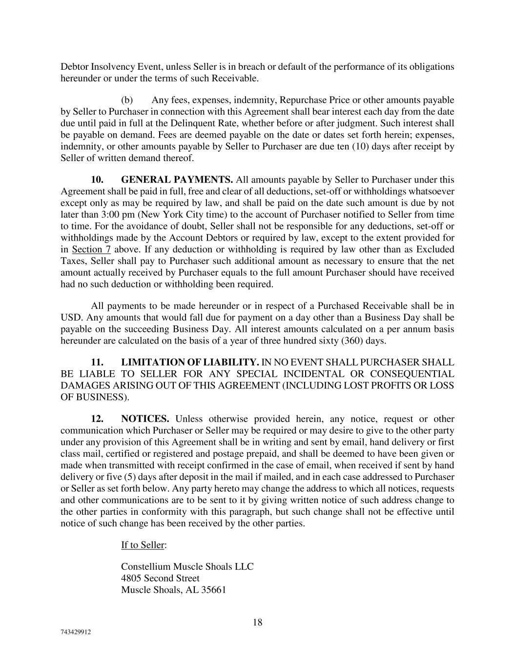 18 743429912 Debtor Insolvency Event, unless Seller is in breach or default of the performance of its obligations hereunder or under the terms of such Receivable. (b) Any fees, expenses, indemnity, Repurchase Price or other amounts payable by Seller to Purchaser in connection with this Agreement shall bear interest each day from the date due until paid in full at the Delinquent Rate, whether before or after judgment. Such interest shall be payable on demand. Fees are deemed payable on the date or dates set forth herein; expenses, indemnity, or other amounts payable by Seller to Purchaser are due ten (10) days after receipt by Seller of written demand thereof. 10. GENERAL PAYMENTS. All amounts payable by Seller to Purchaser under this Agreement shall be paid in full, free and clear of all deductions, set-off or withholdings whatsoever except only as may be required by law, and shall be paid on the date such amount is due by not later than 3:00 pm (New York City time) to the account of Purchaser notified to Seller from time to time. For the avoidance of doubt, Seller shall not be responsible for any deductions, set-off or withholdings made by the Account Debtors or required by law, except to the extent provided for in Section 7 above. If any deduction or withholding is required by law other than as Excluded Taxes, Seller shall pay to Purchaser such additional amount as necessary to ensure that the net amount actually received by Purchaser equals to the full amount Purchaser should have received had no such deduction or withholding been required. All payments to be made hereunder or in respect of a Purchased Receivable shall be in USD. Any amounts that would fall due for payment on a day other than a Business Day shall be payable on the succeeding Business Day. All interest amounts calculated on a per annum basis hereunder are calculated on the basis of a year of three hundred sixty (360) days. 11. LIMITATION OF LIABILITY. IN NO EVENT SHALL PURCHASER SHALL BE LIABLE TO SELLER FOR ANY SPECIAL INCIDENTAL OR CONSEQUENTIAL DAMAGES ARISING OUT OF THIS AGREEMENT (INCLUDING LOST PROFITS OR LOSS OF BUSINESS). 12. NOTICES. Unless otherwise provided herein, any notice, request or other communication which Purchaser or Seller may be required or may desire to give to the other party under any provision of this Agreement shall be in writing and sent by email, hand delivery or first class mail, certified or registered and postage prepaid, and shall be deemed to have been given or made when transmitted with receipt confirmed in the case of email, when received if sent by hand delivery or five (5) days after deposit in the mail if mailed, and in each case addressed to Purchaser or Seller as set forth below. Any party hereto may change the address to which all notices, requests and other communications are to be sent to it by giving written notice of such address change to the other parties in conformity with this paragraph, but such change shall not be effective until notice of such change has been received by the other parties. If to Seller: Constellium Muscle Shoals LLC 4805 Second Street Muscle Shoals, AL 35661