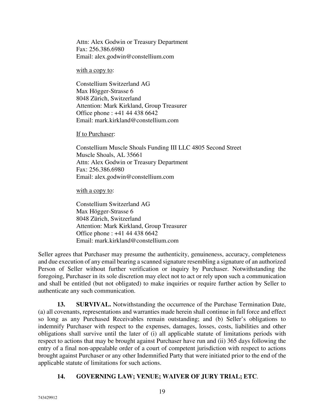 19 743429912 Attn: Alex Godwin or Treasury Department Fax: 256.386.6980 Email: alex.godwin@constellium.com with a copy to: Constellium Switzerland AG Max Högger-Strasse 6 8048 Zürich, Switzerland Attention: Mark Kirkland, Group Treasurer Office phone : +41 44 438 6642 Email: mark.kirkland@constellium.com If to Purchaser: Constellium Muscle Shoals Funding III LLC 4805 Second Street Muscle Shoals, AL 35661 Attn: Alex Godwin or Treasury Department Fax: 256.386.6980 Email: alex.godwin@constellium.com with a copy to: Constellium Switzerland AG Max Högger-Strasse 6 8048 Zürich, Switzerland Attention: Mark Kirkland, Group Treasurer Office phone : +41 44 438 6642 Email: mark.kirkland@constellium.com Seller agrees that Purchaser may presume the authenticity, genuineness, accuracy, completeness and due execution of any email bearing a scanned signature resembling a signature of an authorized Person of Seller without further verification or inquiry by Purchaser. Notwithstanding the foregoing, Purchaser in its sole discretion may elect not to act or rely upon such a communication and shall be entitled (but not obligated) to make inquiries or require further action by Seller to authenticate any such communication. 13. SURVIVAL. Notwithstanding the occurrence of the Purchase Termination Date, (a) all covenants, representations and warranties made herein shall continue in full force and effect so long as any Purchased Receivables remain outstanding; and (b) Seller’s obligations to indemnify Purchaser with respect to the expenses, damages, losses, costs, liabilities and other obligations shall survive until the later of (i) all applicable statute of limitations periods with respect to actions that may be brought against Purchaser have run and (ii) 365 days following the entry of a final non-appealable order of a court of competent jurisdiction with respect to actions brought against Purchaser or any other Indemnified Party that were initiated prior to the end of the applicable statute of limitations for such actions. 14. GOVERNING LAW; VENUE; WAIVER OF JURY TRIAL; ETC.