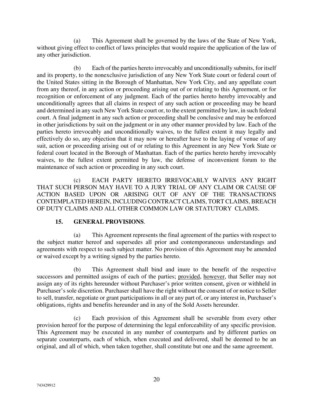 20 743429912 (a) This Agreement shall be governed by the laws of the State of New York, without giving effect to conflict of laws principles that would require the application of the law of any other jurisdiction. (b) Each of the parties hereto irrevocably and unconditionally submits, for itself and its property, to the nonexclusive jurisdiction of any New York State court or federal court of the United States sitting in the Borough of Manhattan, New York City, and any appellate court from any thereof, in any action or proceeding arising out of or relating to this Agreement, or for recognition or enforcement of any judgment. Each of the parties hereto hereby irrevocably and unconditionally agrees that all claims in respect of any such action or proceeding may be heard and determined in any such New York State court or, to the extent permitted by law, in such federal court. A final judgment in any such action or proceeding shall be conclusive and may be enforced in other jurisdictions by suit on the judgment or in any other manner provided by law. Each of the parties hereto irrevocably and unconditionally waives, to the fullest extent it may legally and effectively do so, any objection that it may now or hereafter have to the laying of venue of any suit, action or proceeding arising out of or relating to this Agreement in any New York State or federal court located in the Borough of Manhattan. Each of the parties hereto hereby irrevocably waives, to the fullest extent permitted by law, the defense of inconvenient forum to the maintenance of such action or proceeding in any such court. (c) EACH PARTY HERETO IRREVOCABLY WAIVES ANY RIGHT THAT SUCH PERSON MAY HAVE TO A JURY TRIAL OF ANY CLAIM OR CAUSE OF ACTION BASED UPON OR ARISING OUT OF ANY OF THE TRANSACTIONS CONTEMPLATED HEREIN, INCLUDING CONTRACT CLAIMS, TORT CLAIMS, BREACH OF DUTY CLAIMS AND ALL OTHER COMMON LAW OR STATUTORY CLAIMS. 15. GENERAL PROVISIONS. (a) This Agreement represents the final agreement of the parties with respect to the subject matter hereof and supersedes all prior and contemporaneous understandings and agreements with respect to such subject matter. No provision of this Agreement may be amended or waived except by a writing signed by the parties hereto. (b) This Agreement shall bind and inure to the benefit of the respective successors and permitted assigns of each of the parties; provided, however, that Seller may not assign any of its rights hereunder without Purchaser’s prior written consent, given or withheld in Purchaser’s sole discretion. Purchaser shall have the right without the consent of or notice to Seller to sell, transfer, negotiate or grant participations in all or any part of, or any interest in, Purchaser’s obligations, rights and benefits hereunder and in any of the Sold Assets hereunder. (c) Each provision of this Agreement shall be severable from every other provision hereof for the purpose of determining the legal enforceability of any specific provision. This Agreement may be executed in any number of counterparts and by different parties on separate counterparts, each of which, when executed and delivered, shall be deemed to be an original, and all of which, when taken together, shall constitute but one and the same agreement.