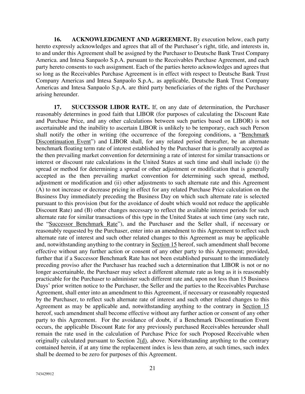 21 743429912 16. ACKNOWLEDGMENT AND AGREEMENT. By execution below, each party hereto expressly acknowledges and agrees that all of the Purchaser’s right, title, and interests in, to and under this Agreement shall be assigned by the Purchaser to Deutsche Bank Trust Company America. and Intesa Sanpaolo S.p.A. pursuant to the Receivables Purchase Agreement, and each party hereto consents to such assignment. Each of the parties hereto acknowledges and agrees that so long as the Receivables Purchase Agreement is in effect with respect to Deutsche Bank Trust Company Americas and Intesa Sanpaolo S.p.A,. as applicable, Deutsche Bank Trust Company Americas and Intesa Sanpaolo S.p.A. are third party beneficiaries of the rights of the Purchaser arising hereunder. 17. SUCCESSOR LIBOR RATE. If, on any date of determination, the Purchaser reasonably determines in good faith that LIBOR (for purposes of calculating the Discount Rate and Purchase Price, and any other calculations between such parties based on LIBOR) is not ascertainable and the inability to ascertain LIBOR is unlikely to be temporary, each such Person shall notify the other in writing (the occurrence of the foregoing conditions, a “Benchmark Discontinuation Event”) and LIBOR shall, for any related period thereafter, be an alternate benchmark floating term rate of interest established by the Purchaser that is generally accepted as the then prevailing market convention for determining a rate of interest for similar transactions or interest or discount rate calculations in the United States at such time and shall include (i) the spread or method for determining a spread or other adjustment or modification that is generally accepted as the then prevailing market convention for determining such spread, method, adjustment or modification and (ii) other adjustments to such alternate rate and this Agreement (A) to not increase or decrease pricing in effect for any related Purchase Price calculation on the Business Day immediately preceding the Business Day on which such alternate rate is selected pursuant to this provision (but for the avoidance of doubt which would not reduce the applicable Discount Rate) and (B) other changes necessary to reflect the available interest periods for such alternate rate for similar transactions of this type in the United States at such time (any such rate, the “Successor Benchmark Rate”), and the Purchaser and the Seller shall, if necessary or reasonably requested by the Purchaser, enter into an amendment to this Agreement to reflect such alternate rate of interest and such other related changes to this Agreement as may be applicable and, notwithstanding anything to the contrary in Section 15 hereof, such amendment shall become effective without any further action or consent of any other party to this Agreement; provided, further that if a Successor Benchmark Rate has not been established pursuant to the immediately preceding proviso after the Purchaser has reached such a determination that LIBOR is not or no longer ascertainable, the Purchaser may select a different alternate rate as long as it is reasonably practicable for the Purchaser to administer such different rate and, upon not less than 15 Business Days’ prior written notice to the Purchaser, the Seller and the parties to the Receivables Purchase Agreement, shall enter into an amendment to this Agreement, if necessary or reasonably requested by the Purchaser, to reflect such alternate rate of interest and such other related changes to this Agreement as may be applicable and, notwithstanding anything to the contrary in Section 15 hereof, such amendment shall become effective without any further action or consent of any other party to this Agreement. For the avoidance of doubt, if a Benchmark Discontinuation Event occurs, the applicable Discount Rate for any previously purchased Receivables hereunder shall remain the rate used in the calculation of Purchase Price for such Proposed Receivable when originally calculated pursuant to Section 2(d), above. Notwithstanding anything to the contrary contained herein, if at any time the replacement index is less than zero, at such times, such index shall be deemed to be zero for purposes of this Agreement.