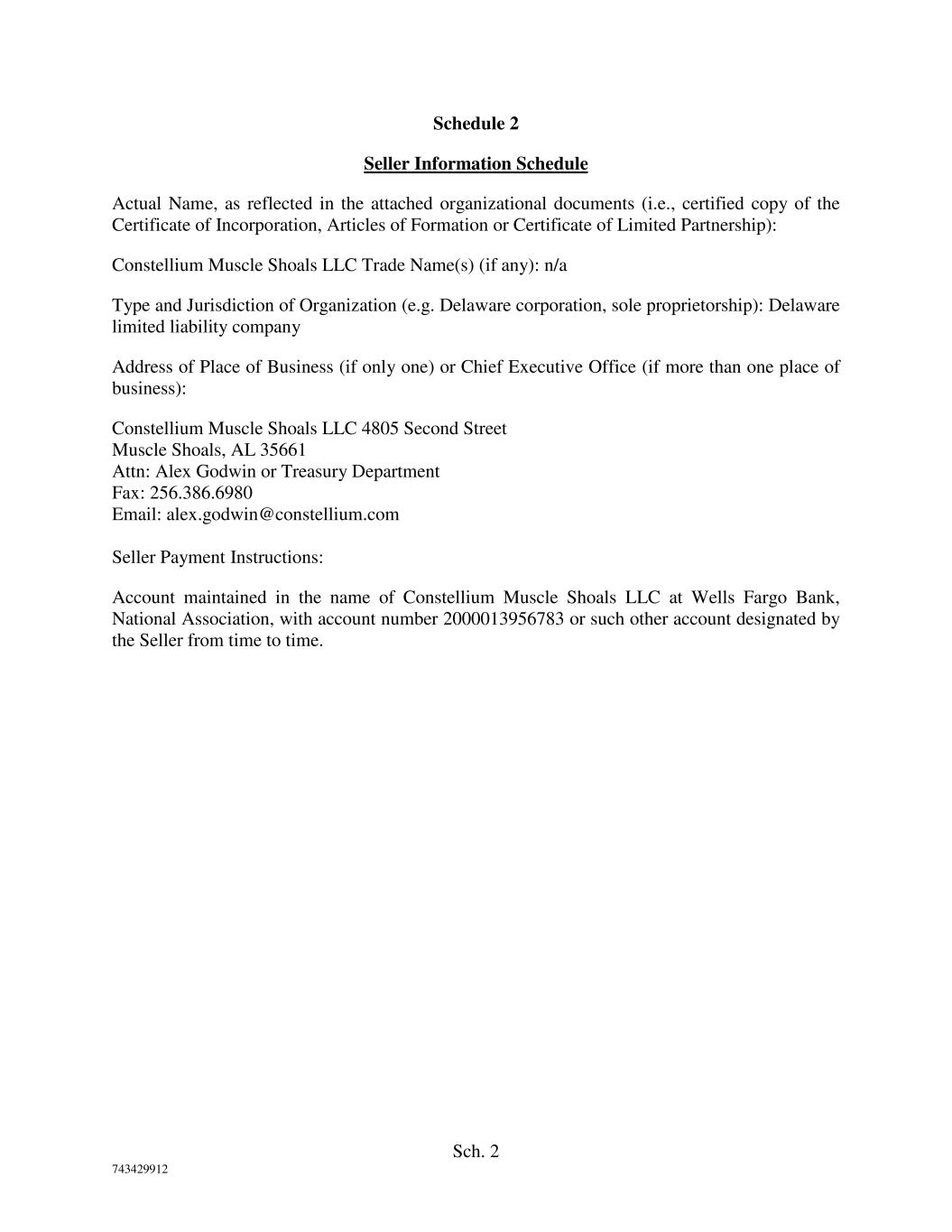 Sch. 2 743429912 Schedule 2 Seller Information Schedule Actual Name, as reflected in the attached organizational documents (i.e., certified copy of the Certificate of Incorporation, Articles of Formation or Certificate of Limited Partnership): Constellium Muscle Shoals LLC Trade Name(s) (if any): n/a Type and Jurisdiction of Organization (e.g. Delaware corporation, sole proprietorship): Delaware limited liability company Address of Place of Business (if only one) or Chief Executive Office (if more than one place of business): Constellium Muscle Shoals LLC 4805 Second Street Muscle Shoals, AL 35661 Attn: Alex Godwin or Treasury Department Fax: 256.386.6980 Email: alex.godwin@constellium.com Seller Payment Instructions: Account maintained in the name of Constellium Muscle Shoals LLC at Wells Fargo Bank, National Association, with account number 2000013956783 or such other account designated by the Seller from time to time.
