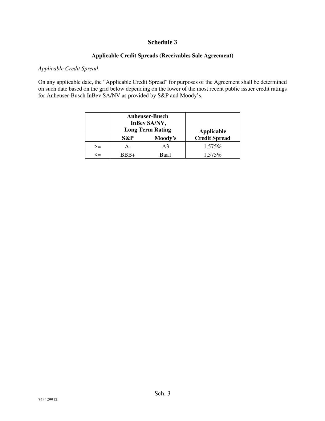 Sch. 3 743429912 Schedule 3 Applicable Credit Spreads (Receivables Sale Agreement) Applicable Credit Spread On any applicable date, the “Applicable Credit Spread” for purposes of the Agreement shall be determined on such date based on the grid below depending on the lower of the most recent public issuer credit ratings for Anheuser-Busch InBev SA/NV as provided by S&P and Moody’s. Anheuser-Busch InBev SA/NV, Long Term Rating Applicable Credit Spread S&P Moody’s >= A- A3 1.575% <= BBB+ Baa1 1.575%