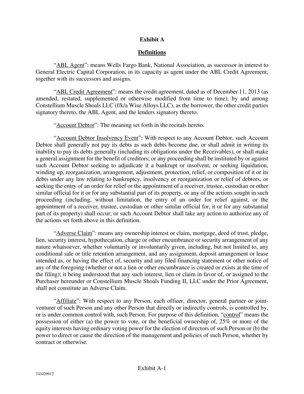 Exhibit A-1 743429912 Exhibit A Definitions “ABL Agent”: means Wells Fargo Bank, National Association, as successor in interest to General Electric Capital Corporation, in its capacity as agent under the ABL Credit Agreement, together with its successors and assigns. “ABL Credit Agreement”: means the credit agreement, dated as of December 11, 2013 (as amended, restated, supplemented or otherwise modified from time to time), by and among Constellium Muscle Shoals LLC (f/k/a Wise Alloys LLC), as the borrower, the other credit parties signatory thereto, the ABL Agent, and the lenders signatory thereto. “Account Debtor”: The meaning set forth in the recitals hereto. “Account Debtor Insolvency Event”: With respect to any Account Debtor, such Account Debtor shall generally not pay its debts as such debts become due, or shall admit in writing its inability to pay its debts generally (including its obligations under the Receivables), or shall make a general assignment for the benefit of creditors; or any proceeding shall be instituted by or against such Account Debtor seeking to adjudicate it a bankrupt or insolvent, or seeking liquidation, winding up, reorganization, arrangement, adjustment, protection, relief, or composition of it or its debts under any law relating to bankruptcy, insolvency or reorganization or relief of debtors, or seeking the entry of an order for relief or the appointment of a receiver, trustee, custodian or other similar official for it or for any substantial part of its property, or any of the actions sought in such proceeding (including, without limitation, the entry of an order for relief against, or the appointment of a receiver, trustee, custodian or other similar official for, it or for any substantial part of its property) shall occur; or such Account Debtor shall take any action to authorize any of the actions set forth above in this definition. “Adverse Claim”: means any ownership interest or claim, mortgage, deed of trust, pledge, lien, security interest, hypothecation, charge or other encumbrance or security arrangement of any nature whatsoever, whether voluntarily or involuntarily given, including, but not limited to, any conditional sale or title retention arrangement, and any assignment, deposit arrangement or lease intended as, or having the effect of, security and any filed financing statement or other notice of any of the foregoing (whether or not a lien or other encumbrance is created or exists at the time of the filing); it being understood that any such interest, lien or claim in favor of, or assigned to the Purchaser hereunder or Constellium Muscle Shoals Funding II, LLC under the Prior Agreement, shall not constitute an Adverse Claim. “Affiliate”: With respect to any Person, each officer, director, general partner or joint- venturer of such Person and any other Person that directly or indirectly controls, is controlled by, or is under common control with, such Person. For purpose of this definition, “control” means the possession of either (a) the power to vote, or the beneficial ownership of, 25% or more of the equity interests having ordinary voting power for the election of directors of such Person or (b) the power to direct or cause the direction of the management and policies of such Person, whether by contract or otherwise.