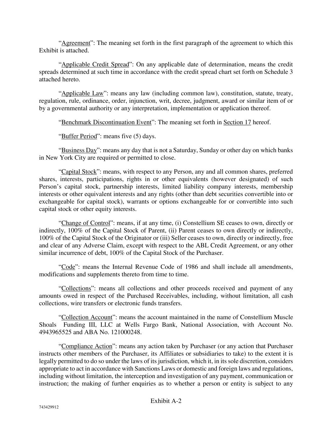 Exhibit A-2 743429912 “Agreement”: The meaning set forth in the first paragraph of the agreement to which this Exhibit is attached. “Applicable Credit Spread”: On any applicable date of determination, means the credit spreads determined at such time in accordance with the credit spread chart set forth on Schedule 3 attached hereto. “Applicable Law”: means any law (including common law), constitution, statute, treaty, regulation, rule, ordinance, order, injunction, writ, decree, judgment, award or similar item of or by a governmental authority or any interpretation, implementation or application thereof. “Benchmark Discontinuation Event”: The meaning set forth in Section 17 hereof. “Buffer Period”: means five (5) days. “Business Day”: means any day that is not a Saturday, Sunday or other day on which banks in New York City are required or permitted to close. “Capital Stock”: means, with respect to any Person, any and all common shares, preferred shares, interests, participations, rights in or other equivalents (however designated) of such Person’s capital stock, partnership interests, limited liability company interests, membership interests or other equivalent interests and any rights (other than debt securities convertible into or exchangeable for capital stock), warrants or options exchangeable for or convertible into such capital stock or other equity interests. “Change of Control”: means, if at any time, (i) Constellium SE ceases to own, directly or indirectly, 100% of the Capital Stock of Parent, (ii) Parent ceases to own directly or indirectly, 100% of the Capital Stock of the Originator or (iii) Seller ceases to own, directly or indirectly, free and clear of any Adverse Claim, except with respect to the ABL Credit Agreement, or any other similar incurrence of debt, 100% of the Capital Stock of the Purchaser. “Code”: means the Internal Revenue Code of 1986 and shall include all amendments, modifications and supplements thereto from time to time. “Collections”: means all collections and other proceeds received and payment of any amounts owed in respect of the Purchased Receivables, including, without limitation, all cash collections, wire transfers or electronic funds transfers. “Collection Account”: means the account maintained in the name of Constellium Muscle Shoals Funding III, LLC at Wells Fargo Bank, National Association, with Account No. 4943965525 and ABA No. 121000248. “Compliance Action”: means any action taken by Purchaser (or any action that Purchaser instructs other members of the Purchaser, its Affiliates or subsidiaries to take) to the extent it is legally permitted to do so under the laws of its jurisdiction, which it, in its sole discretion, considers appropriate to act in accordance with Sanctions Laws or domestic and foreign laws and regulations, including without limitation, the interception and investigation of any payment, communication or instruction; the making of further enquiries as to whether a person or entity is subject to any