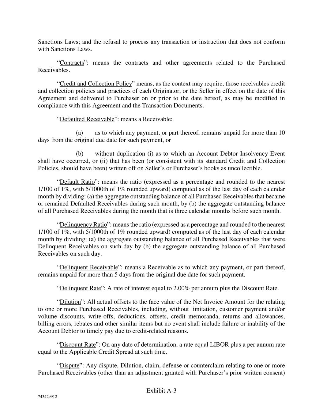Exhibit A-3 743429912 Sanctions Laws; and the refusal to process any transaction or instruction that does not conform with Sanctions Laws. “Contracts”: means the contracts and other agreements related to the Purchased Receivables. “Credit and Collection Policy” means, as the context may require, those receivables credit and collection policies and practices of each Originator, or the Seller in effect on the date of this Agreement and delivered to Purchaser on or prior to the date hereof, as may be modified in compliance with this Agreement and the Transaction Documents. “Defaulted Receivable”: means a Receivable: (a) as to which any payment, or part thereof, remains unpaid for more than 10 days from the original due date for such payment, or (b) without duplication (i) as to which an Account Debtor Insolvency Event shall have occurred, or (ii) that has been (or consistent with its standard Credit and Collection Policies, should have been) written off on Seller’s or Purchaser’s books as uncollectible. “Default Ratio”: means the ratio (expressed as a percentage and rounded to the nearest 1/100 of 1%, with 5/1000th of 1% rounded upward) computed as of the last day of each calendar month by dividing: (a) the aggregate outstanding balance of all Purchased Receivables that became or remained Defaulted Receivables during such month, by (b) the aggregate outstanding balance of all Purchased Receivables during the month that is three calendar months before such month. “Delinquency Ratio”: means the ratio (expressed as a percentage and rounded to the nearest 1/100 of 1%, with 5/1000th of 1% rounded upward) computed as of the last day of each calendar month by dividing: (a) the aggregate outstanding balance of all Purchased Receivables that were Delinquent Receivables on such day by (b) the aggregate outstanding balance of all Purchased Receivables on such day. “Delinquent Receivable”: means a Receivable as to which any payment, or part thereof, remains unpaid for more than 5 days from the original due date for such payment. “Delinquent Rate”: A rate of interest equal to 2.00% per annum plus the Discount Rate. “Dilution”: All actual offsets to the face value of the Net Invoice Amount for the relating to one or more Purchased Receivables, including, without limitation, customer payment and/or volume discounts, write-offs, deductions, offsets, credit memoranda, returns and allowances, billing errors, rebates and other similar items but no event shall include failure or inability of the Account Debtor to timely pay due to credit-related reasons. “Discount Rate”: On any date of determination, a rate equal LIBOR plus a per annum rate equal to the Applicable Credit Spread at such time. “Dispute”: Any dispute, Dilution, claim, defense or counterclaim relating to one or more Purchased Receivables (other than an adjustment granted with Purchaser’s prior written consent)